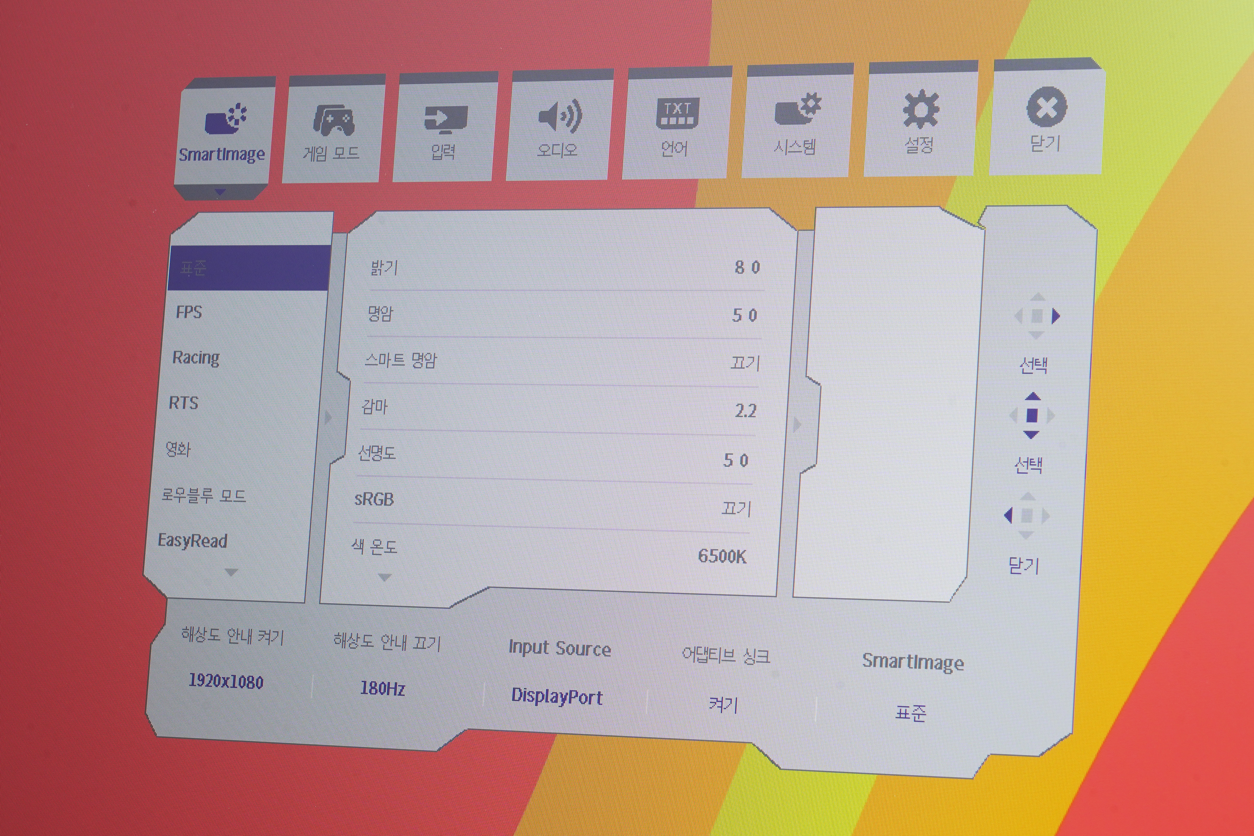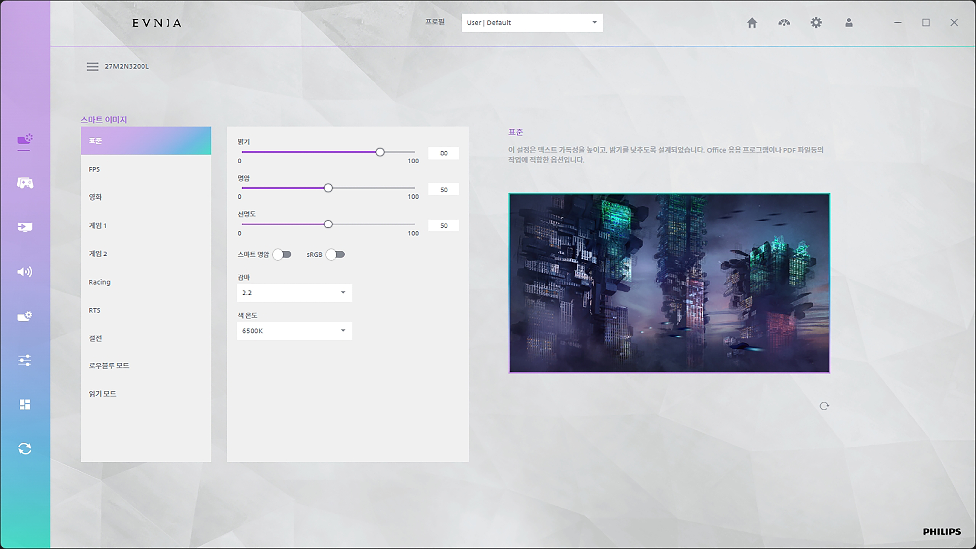 필립스 에브니아 27M2N3200L 모니터의 온 스크린 디스플레이(OSD) 기능을 살펴보면 스마트 이미지(Smart Image)에서는 자신이 플레이하는 게임이나 재생하는 콘텐츠에 맞게 화면의 밝기나 명암을 변경할 수 있습니다. 다양한 색상 프리셋이 준비되어 있으니, 취향에 맞게 간단하게 설정할 수 있습니다.