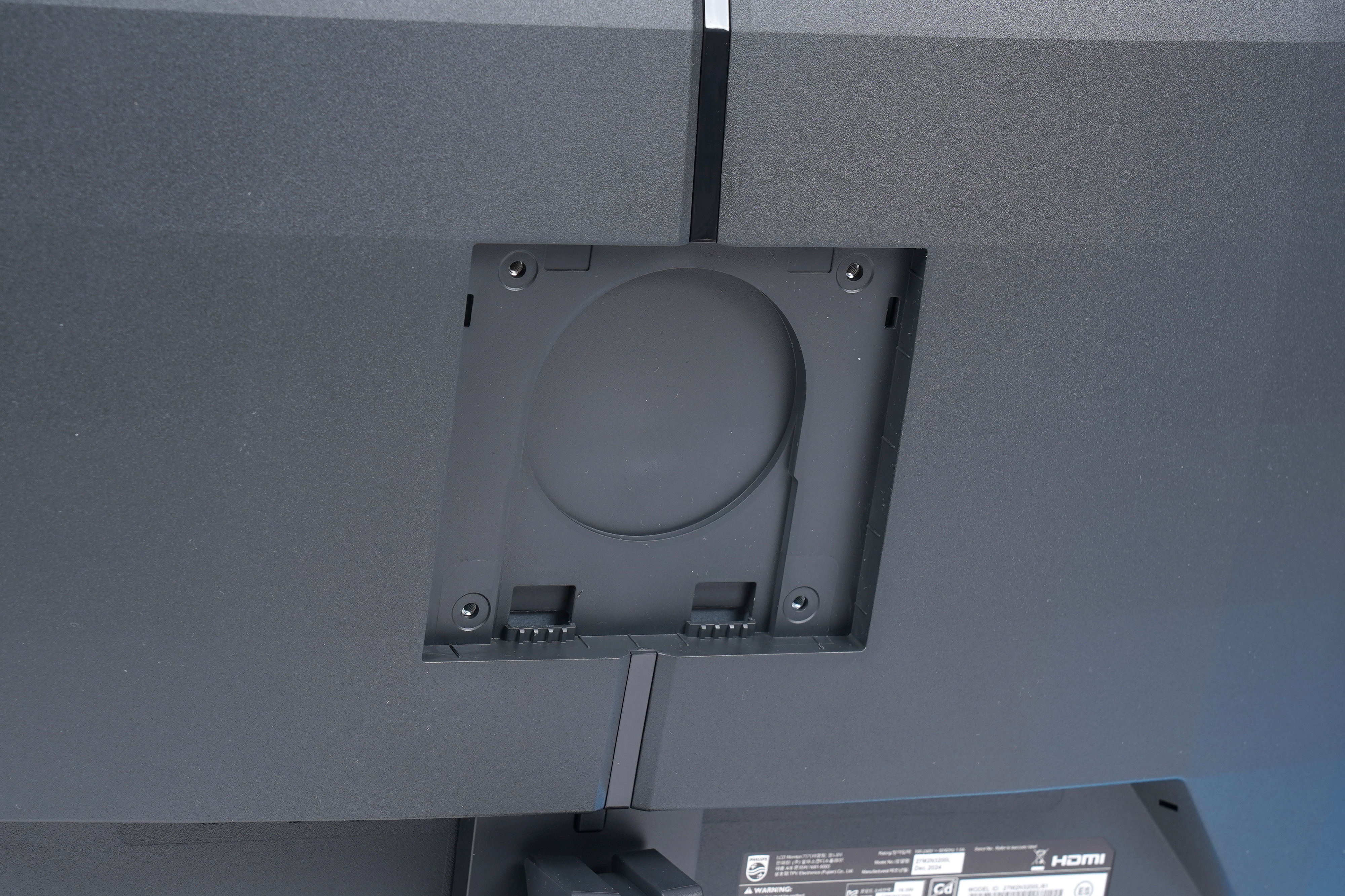 필립스 에브니아 27M2N3200L 모니터는 100 x 100 VESA 홀이 준비되어 있고 사용하지 않을 때 홀 자체를 가리는 용도로 활용할 수 있는 별도의 사각형 커버도 준비되어 있습니다. 참고로 장착은 쉬운 편이지만 탈착은 약간 난이도 있었고 별도의 도구가 필요해 보였습니다.