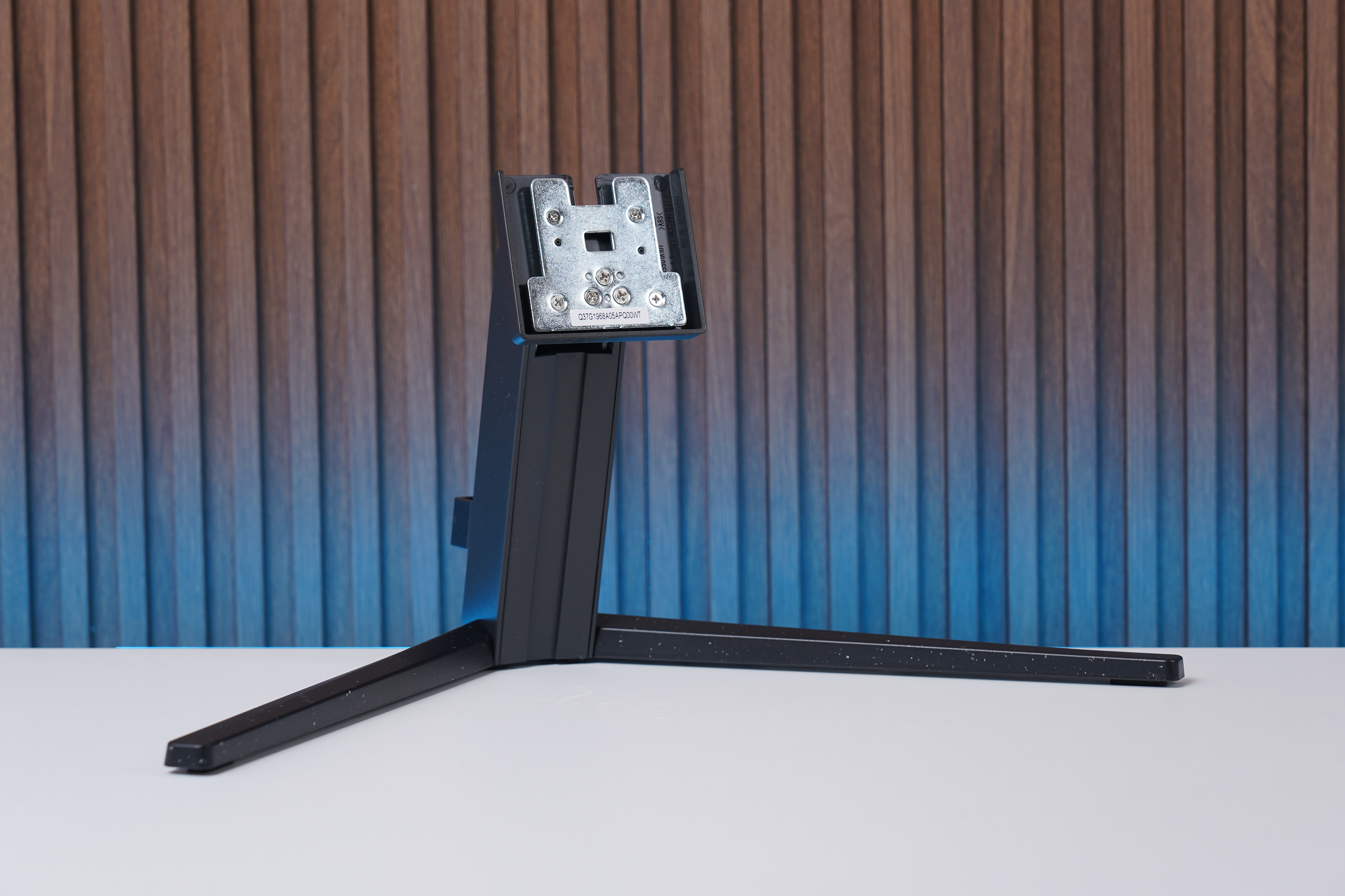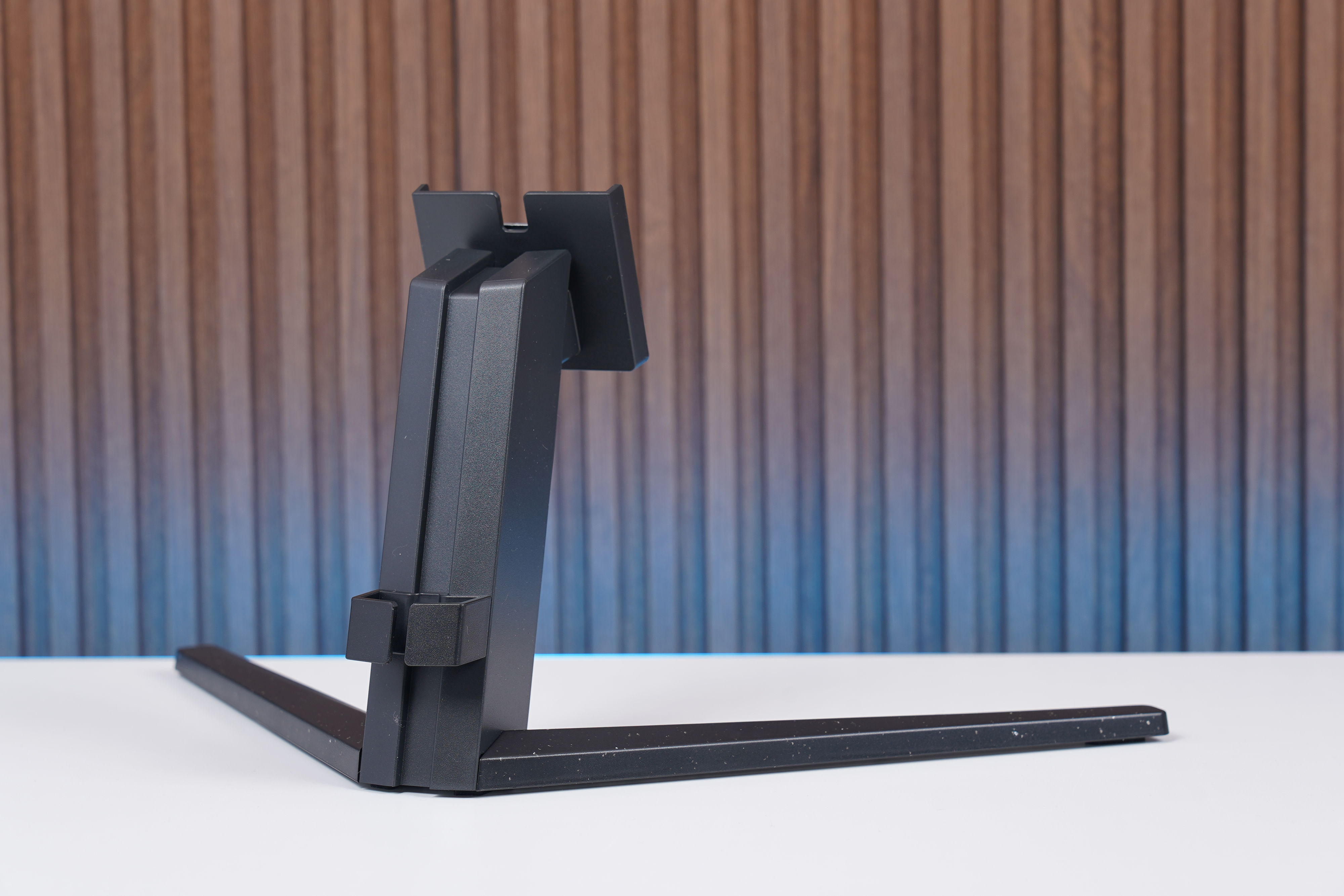 스탠드를 자세하게 살펴보면 에브니아(EVNIA)의 상징적인 텍스처가 돋보이는 형태로 제작되었는데요. 하얀색 점들이 뭍은 형태로 제작되었는데요. 오히려 오염이 잘 눈에 띄지 않는 구조라고 생각되었습니다. 그리고 뒤쪽에는 케이블을 가운데로 모아서 정리할 수 있는 홀더가 배치되어 있습니다.