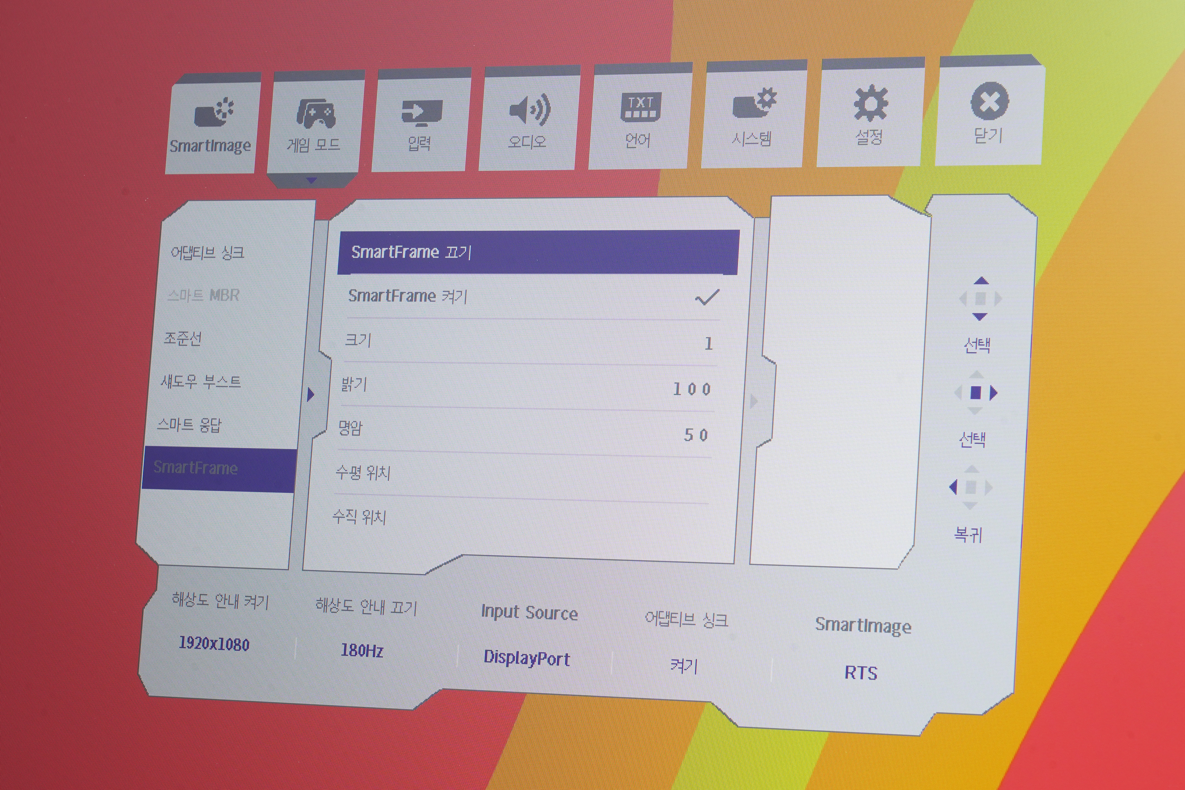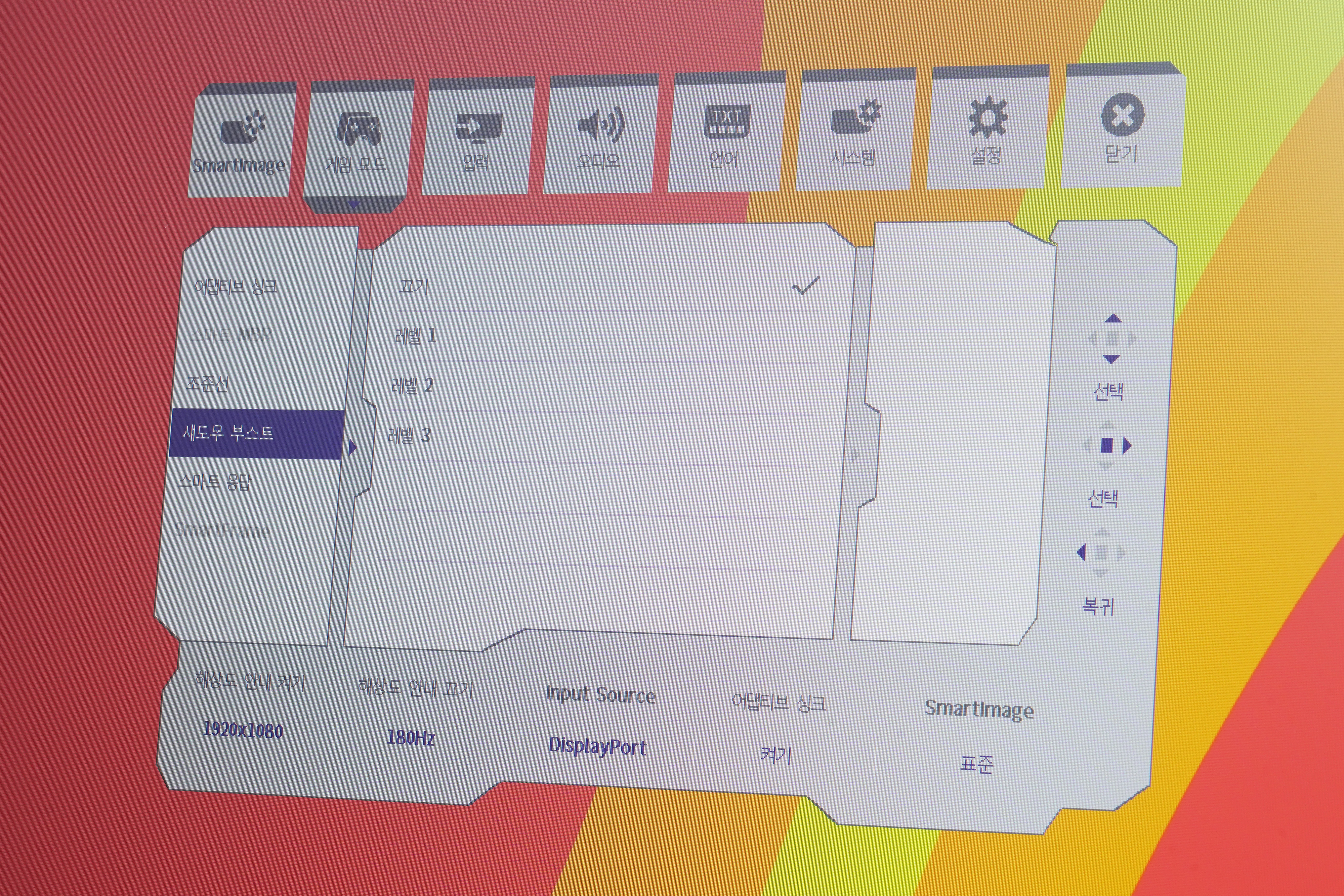 게임 모드를 살펴보면 어댑티브 싱크나 조준선 그리고 섀도우 부스트, 스마트 응답 등 다양한 메뉴가 준비된 것을 확인할 수 있습니다. 적절하게 활용한다면 게임 플레이에 도움을 받을 수 있습니다.
