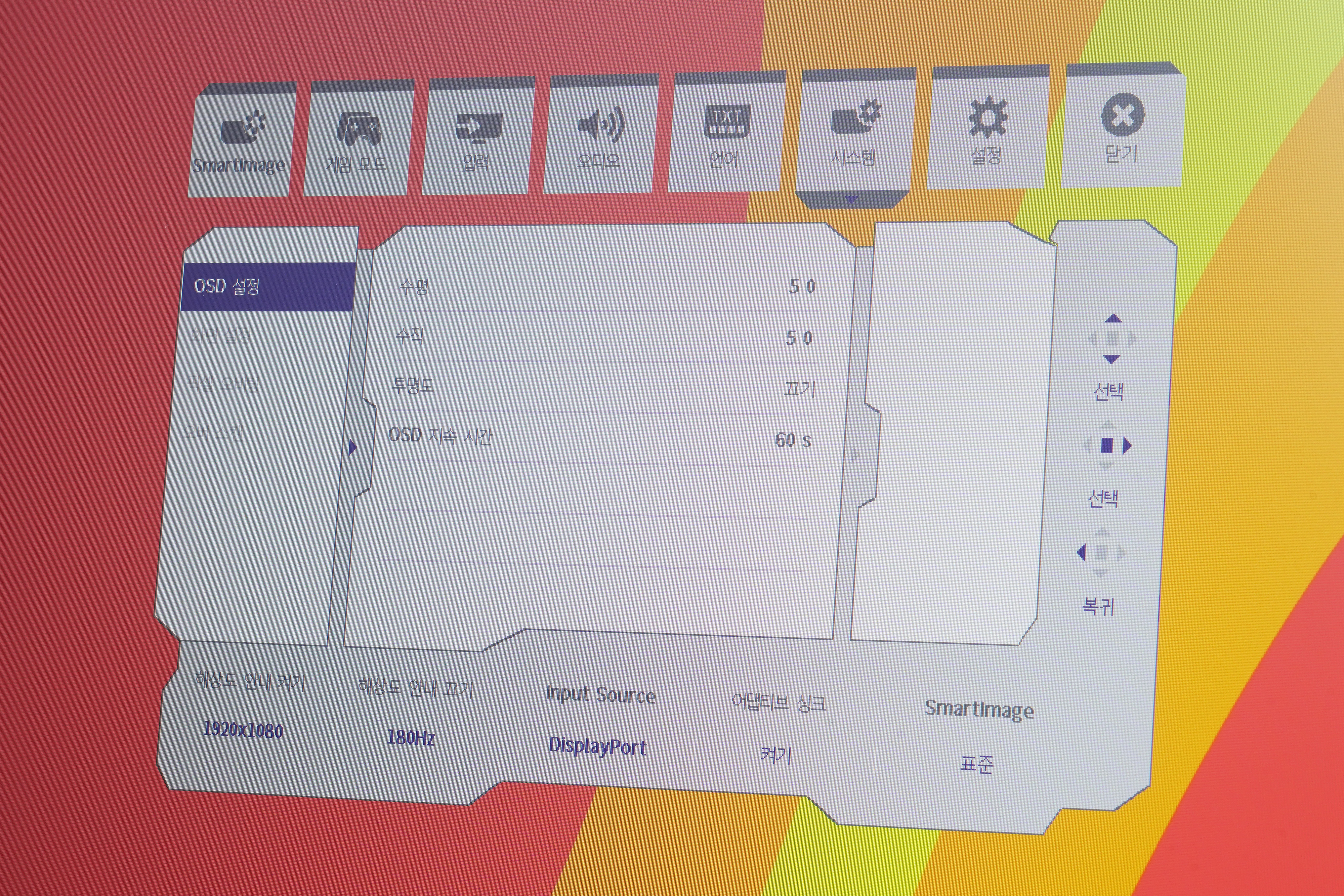 언어에서는 한국어를 비롯한 다양한 나라의 언어로 변경할 수 있고 시스템에서는 OSD를 설정할 수 있습니다. 그리고 설정에서는 전원 LED의 밝기나 정보 그리고 초기화와 같은 메뉴들도 준비되어 있습니다. 메뉴들이 직관적이어서 처음 사용해 보는 분들도 어렵지 않게 적응할 수 있을 것으로 보입니다.