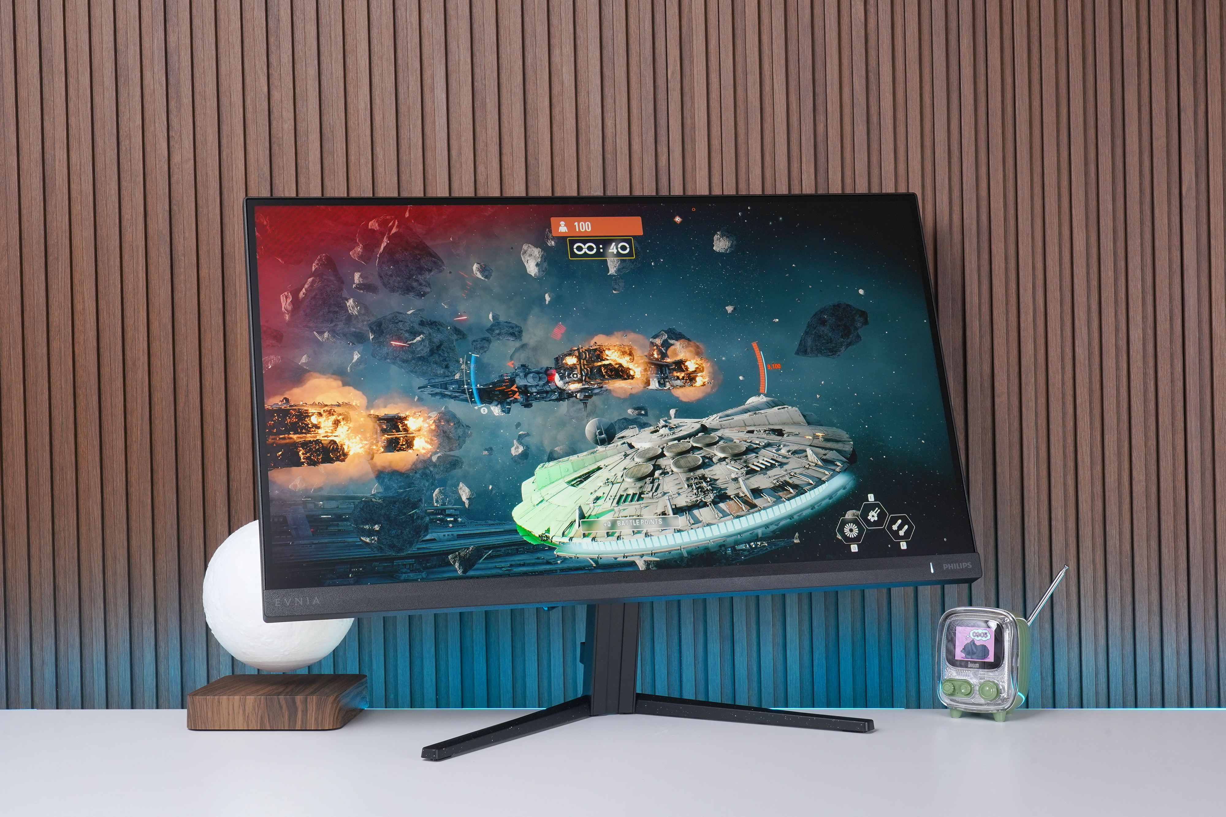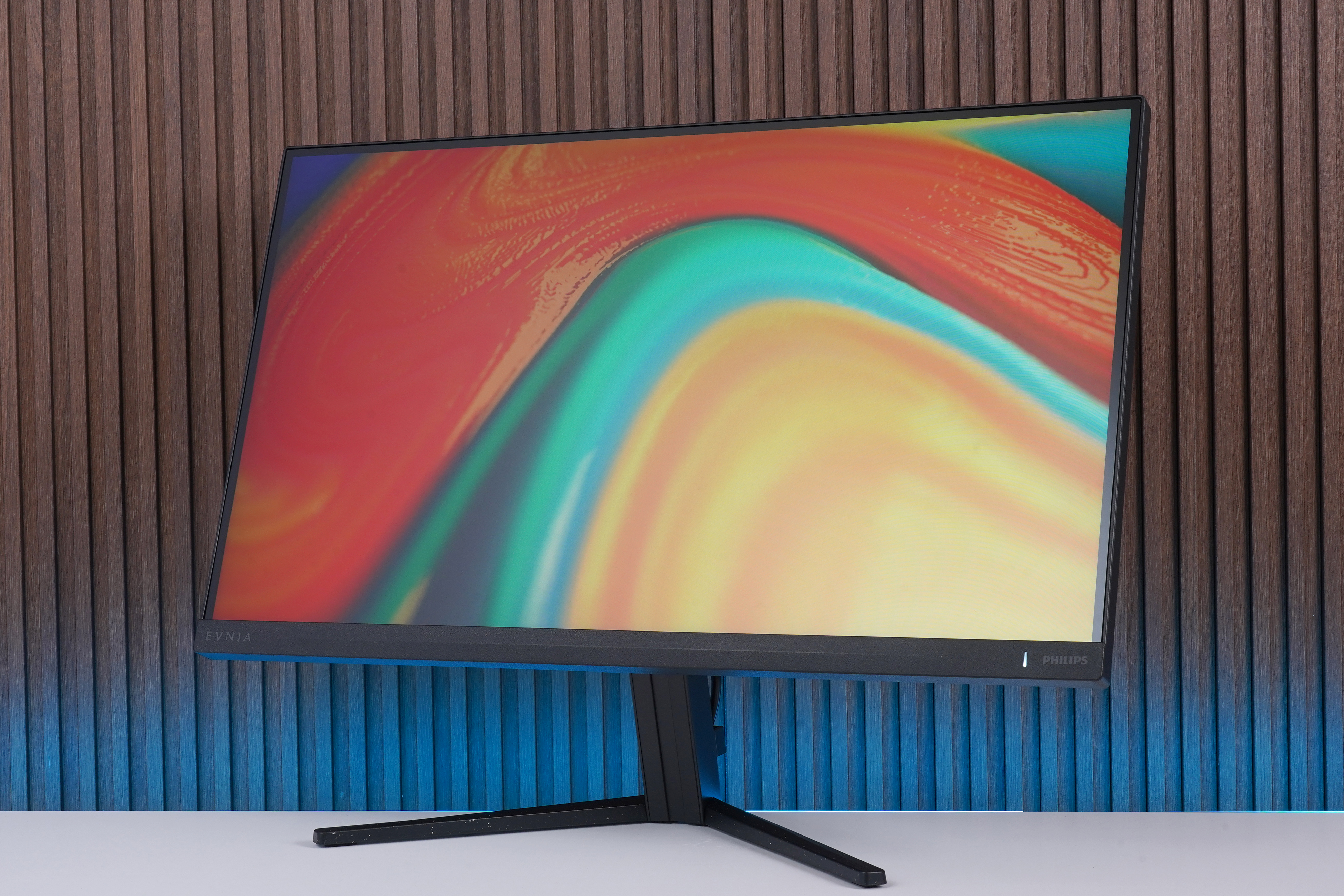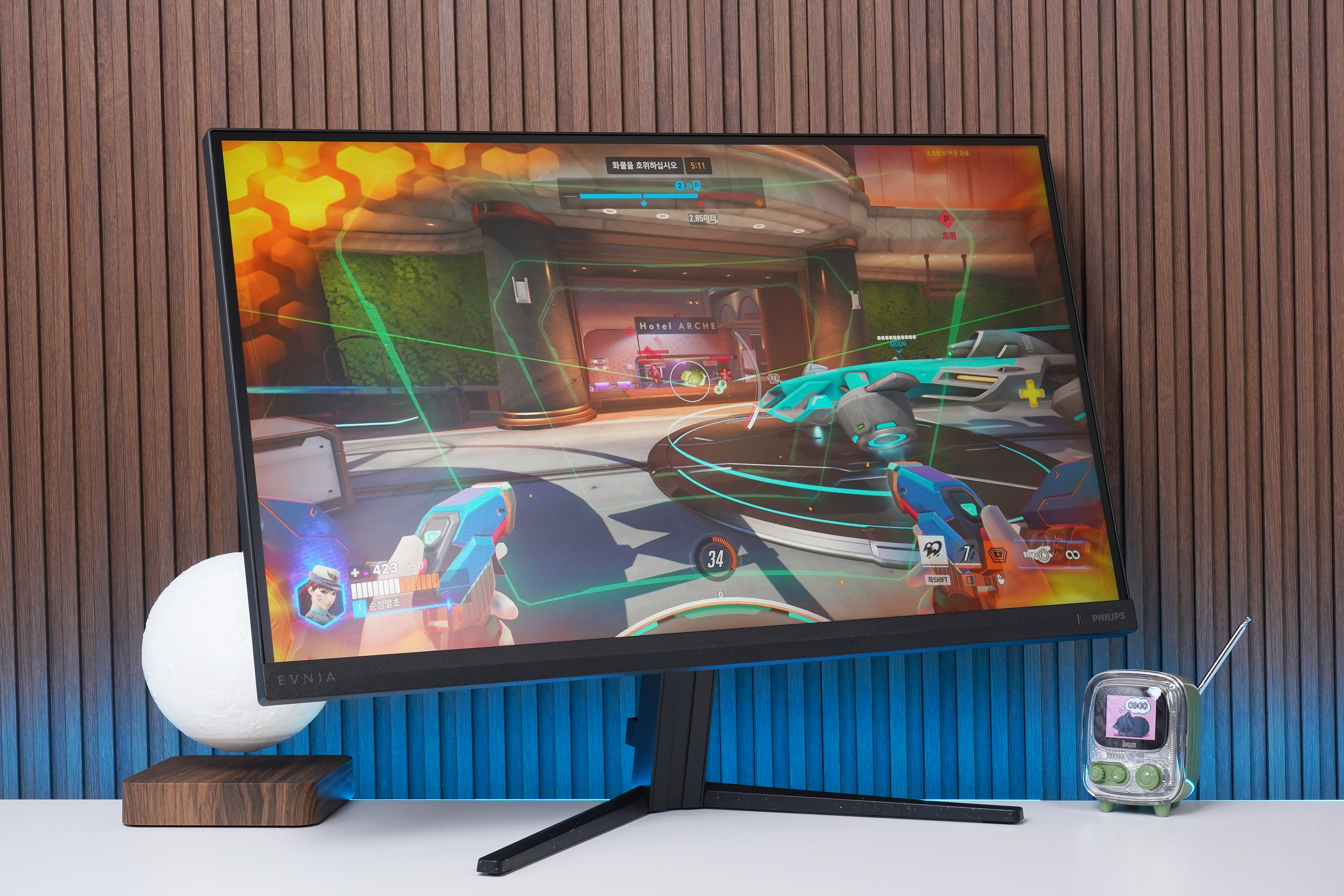 왼쪽 아래를 살펴보면 필립스의 새로운 게이밍 모니터 시리즈인 EVNIA(에브니아)의 로고가 배치되어 있는데요. 건전한 마음과 스마트한 생각을 의미하는 그리스어로 나이와 설명, 게임 수준에 상관없이 누구나 게이머가 될 수 있고 게임을 즐길 수 있다는 것을 의미한다고 한다고 합니다.
