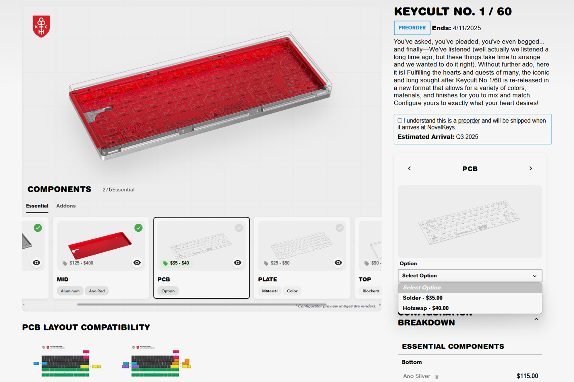 PCB의 경우에는 솔더(납땜 $35 약 5.1만원)와 핫스왑($40 5.8만원)으로 구성되어 있습니다. 솔덜링과 핫스왑 기판의 경우에는 레이아웃이 약간은 다른 편입니다. 취향에 따라서 선택하는 것이 좋을 것 같습니다.