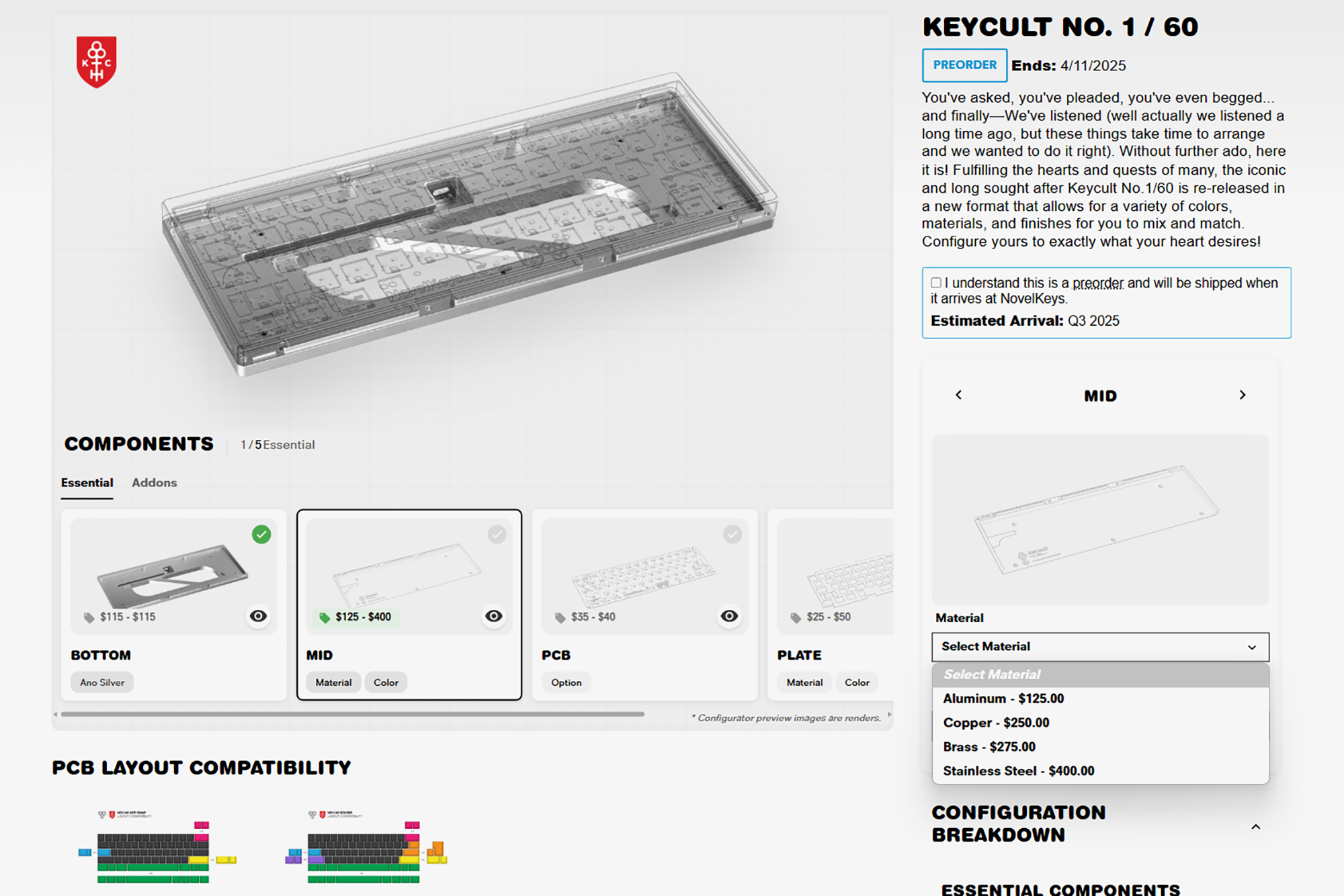 MID(미드)의 경우에는 하판 위에 결합되는 것으로 보이는데요. 소재는 알루미늄(Aluminum, $125 약 18.3만원)과 구리(Copper, $250 약 36.6만원), 황동(Brass, $275 약 40.3만원), 스텐리스 스틸(Stainless Steel $400 약 56.6만원)로 구성되어 있습니다. 역시 스텐리스가 가장 비싼 편입니다. 알루미늄의 경우에는 아노다이징 카모 그린, 네이비, 퍼플, 레드 색상 중에서 선택할 수 있습니다.