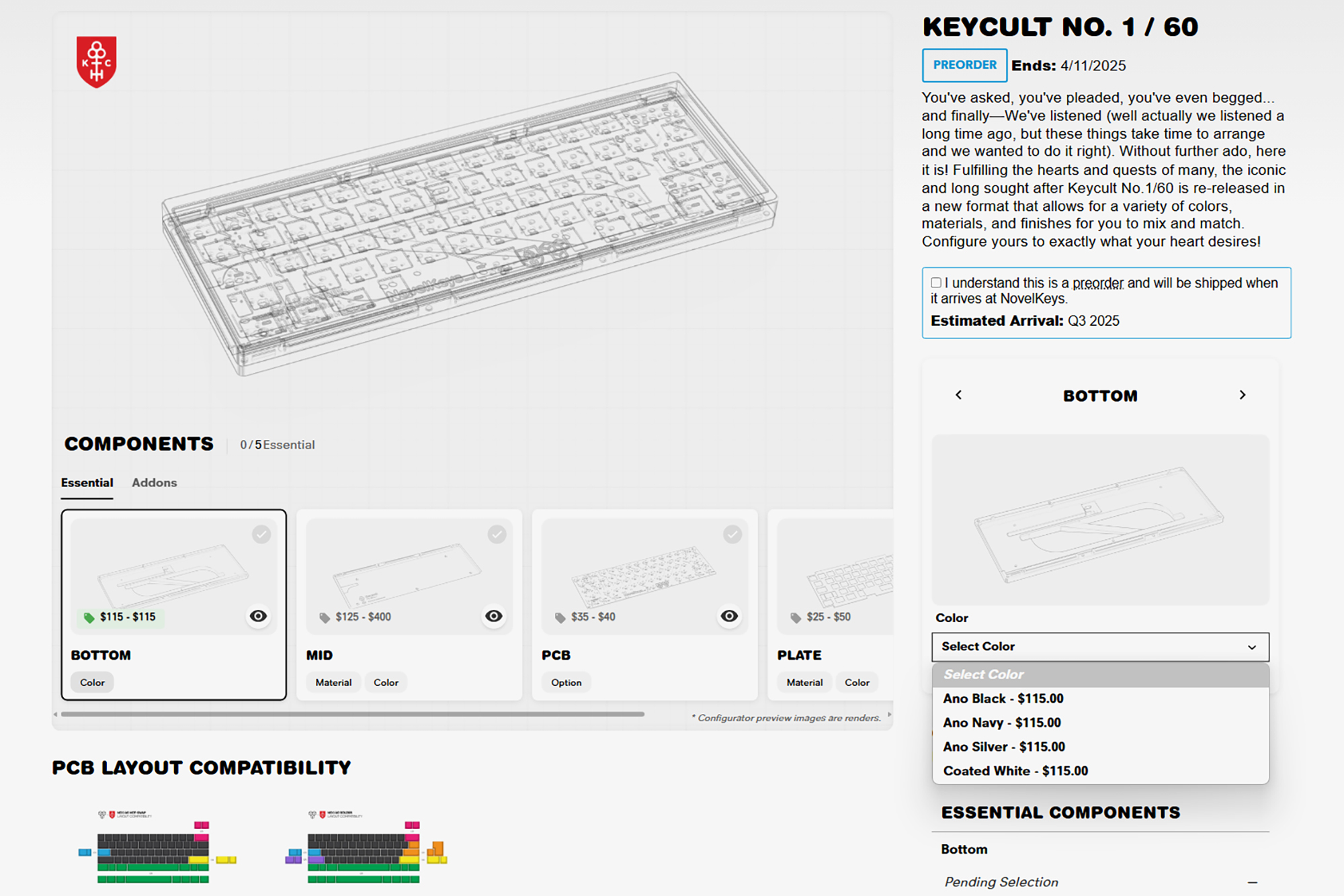 키컬트 No. 1 / 60 커스텀 키보드의 경우에는 자신의 취향에 맞게 조립해서 사용할 수 있습니다. 가장 먼저 BOTTOM(바텀)의 경우에는 아노다이징 블랙, 네이비, 실버와 스프레이 화이트 중에서 선택할 수 있습니다. 그리고 모두 가격은 $115(약 16.8만원)입니다.