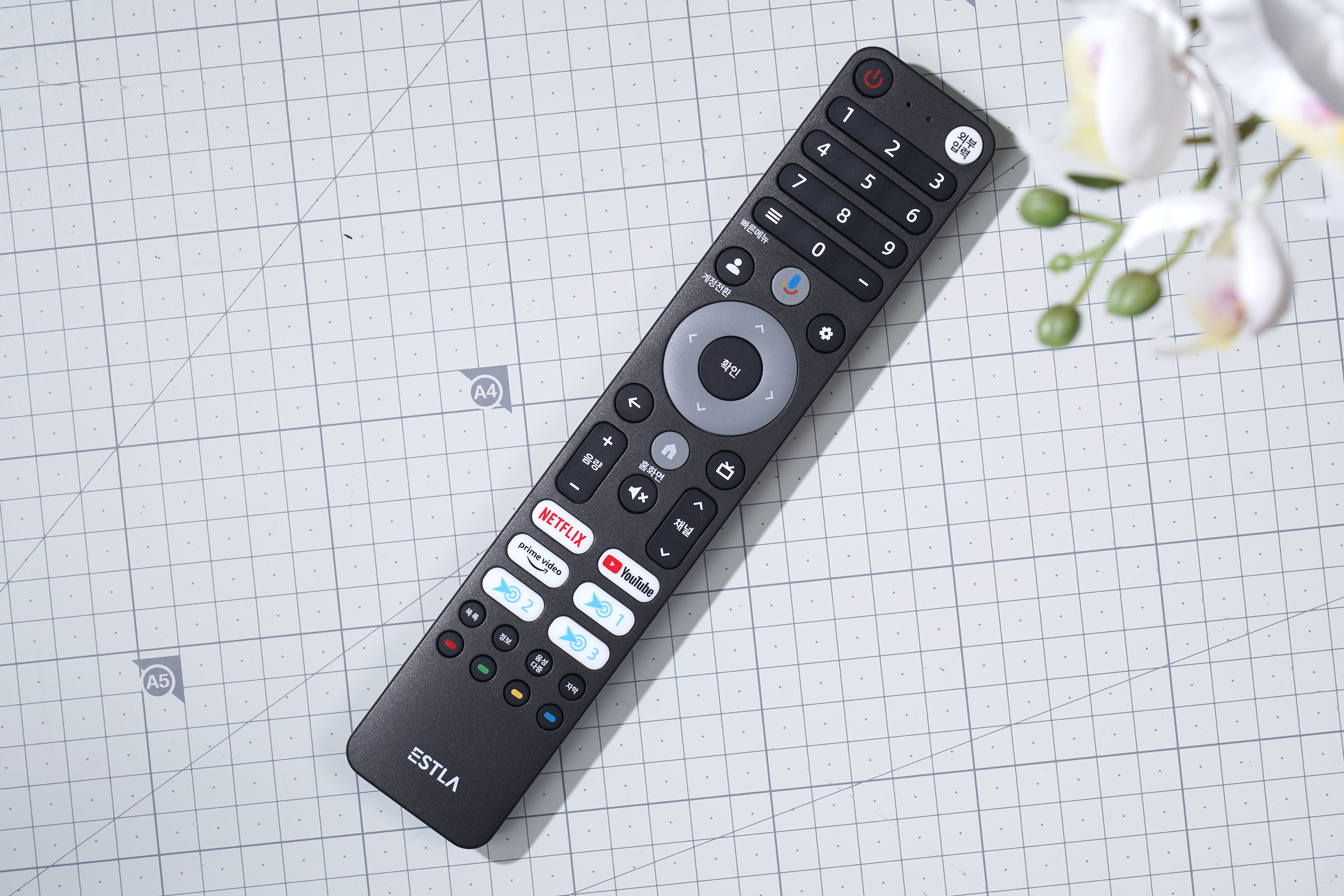 리모컨은 직관적인 형태로 디자인되어서 편리하게 활용할 수 있습니다. 특히 구글 어시스턴트 기능과 자신이 취향에 맞게 커스텀해 사용할 수 있는 프리 핫키 3개가 제공된다는 점이 차별화된 특징입니다. 스마트TV의 리모컨은 버튼이 많을수록 사용하기에 편리한 것 같습니다. 그리고 건전지 2개도 기본으로 제공됩니다.