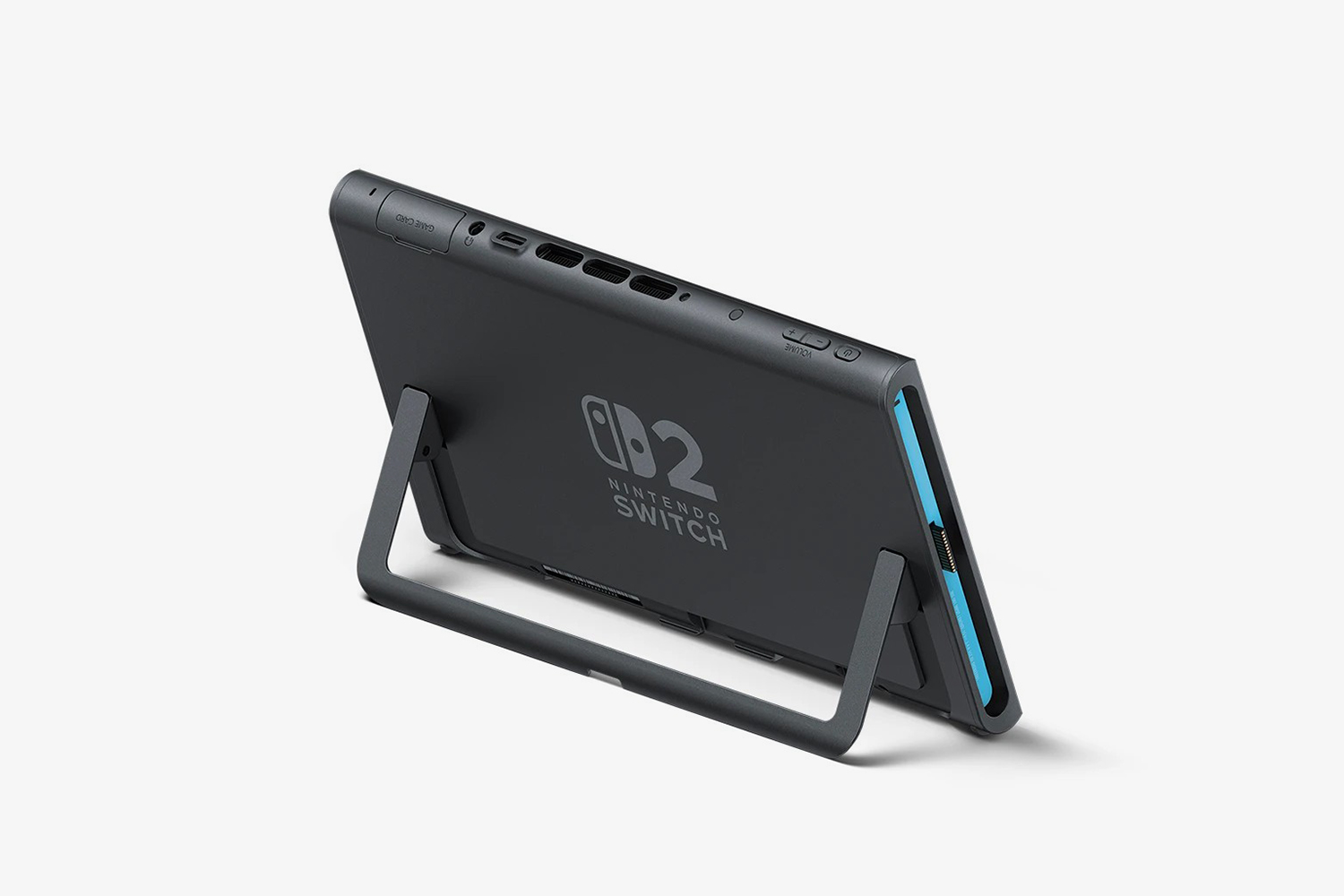 닌텐도 스위치2의 뒷면에는 원하는 각도로 고정할 수 있는 프리 스톱 방식의 스탠드가 기본으로 장착되어 있습니다. 그래서 조금 더 편리하게 활용할 수 있을 것으로 보이고 위쪽에도 USB-C 포트가 새롭게 추가되어서 AC 어댑터를 연결하거나 별매품인 닌텐도 스위치2 카메라를 연결해서 게임챗을 즐길 수도 있다고 합니다.