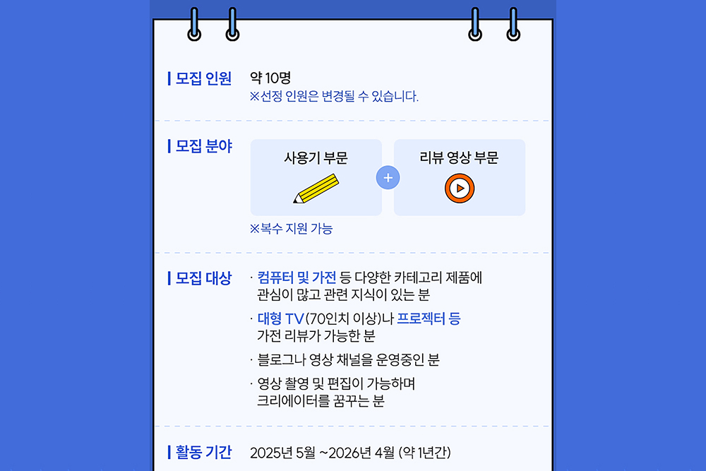 그리고 모집 인원은 약 10명이고 분야는 사용기와 영상 리뷰 두 가지로 구성되어 있고 복수 지원도 가능합니다. 그리고 모집 대상은 컴퓨터와 가전 등에 관심이 많은 리뷰어들이고 TV나 프로젝터 등의 리뷰가 가능하면 좋습니다. 블로거나 유튜버들은 지원하면 좋을 것 같습니다. 참고로 활동 기간은 약 1년 정도입니다.