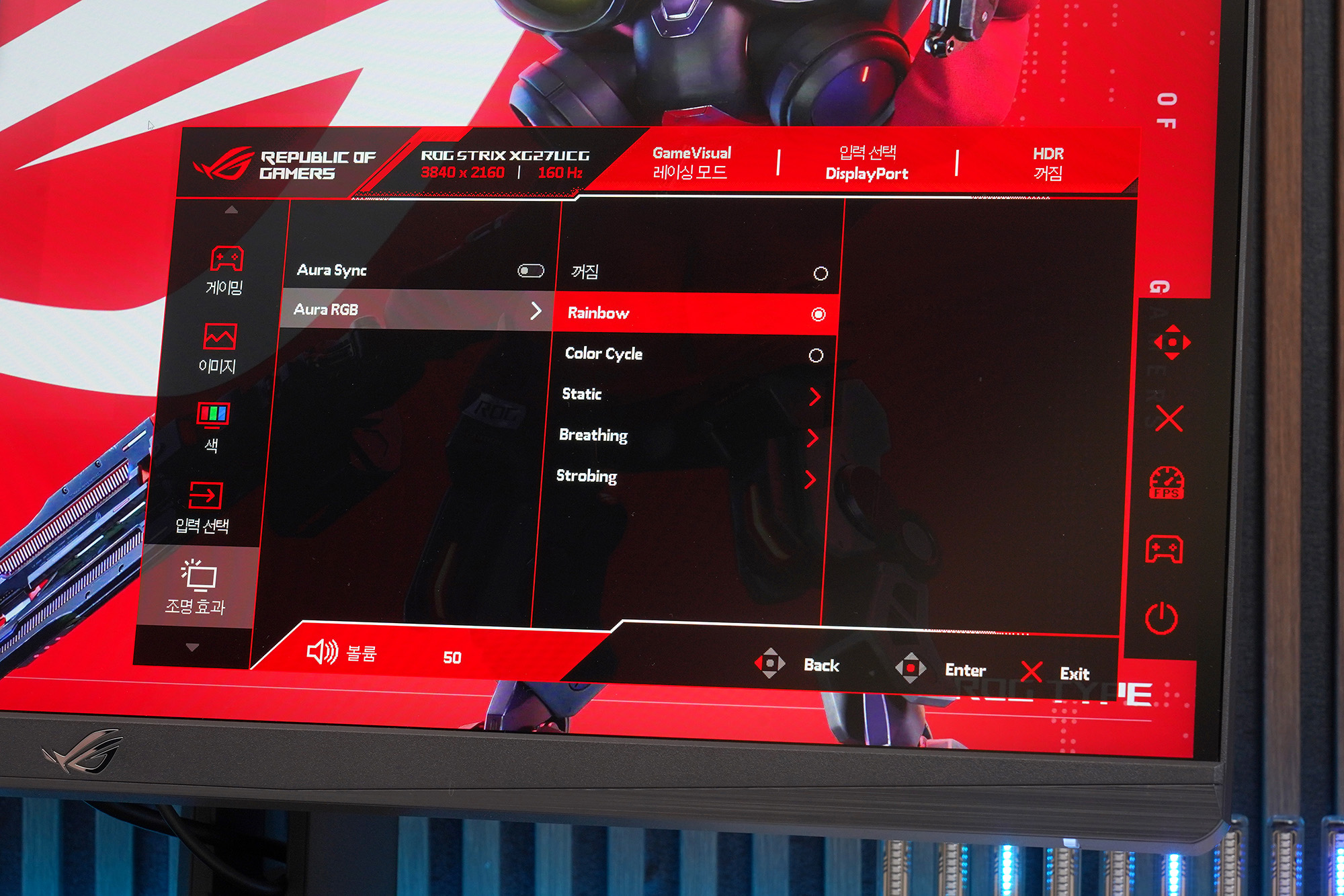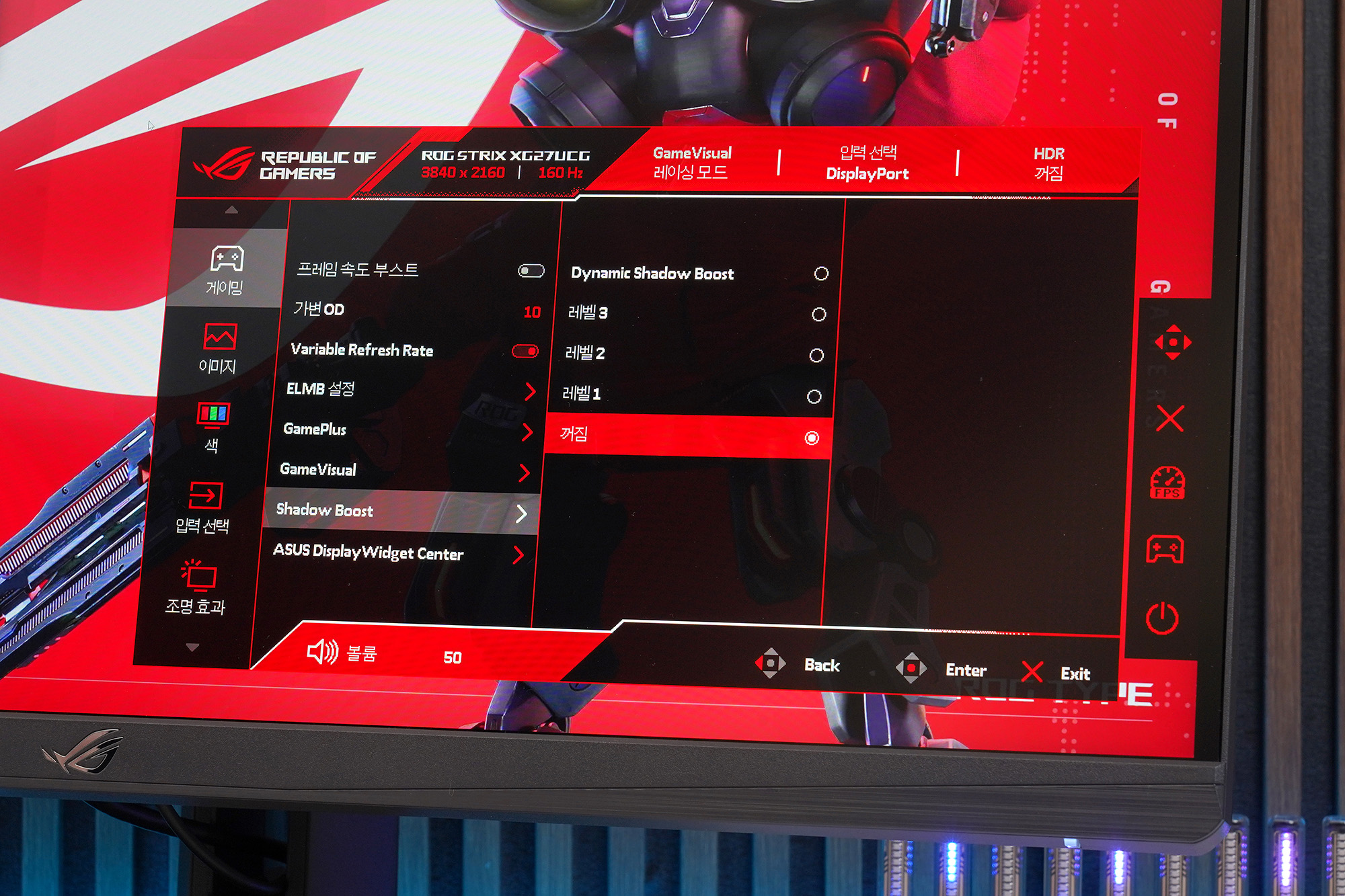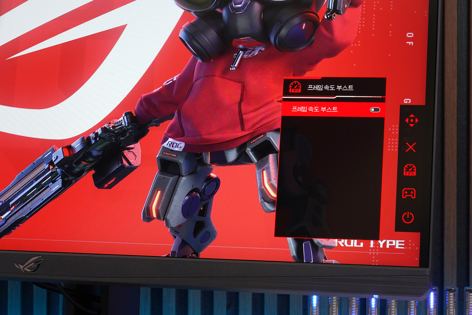 OSD(On-Screen Display)를 통해서 ASUS ROG STRIX XG27UCG 모니터의 기능을 살펴보면 프레임 속도 부스트라는 듀얼 모드 디스플레이 기능을 빠르게 전환할 수 있는데요. 화려한 그래픽이 중요한 게임을 플레이할 때는 4K/UHD 160Hz로 플레이하고 화면 전환이 빠른 발로란트와 같은 경쟁적인 FPS 게임을 플레이할 때는 FHD 320Hz로 설정해서 플레이하는 것을 추천합니다.