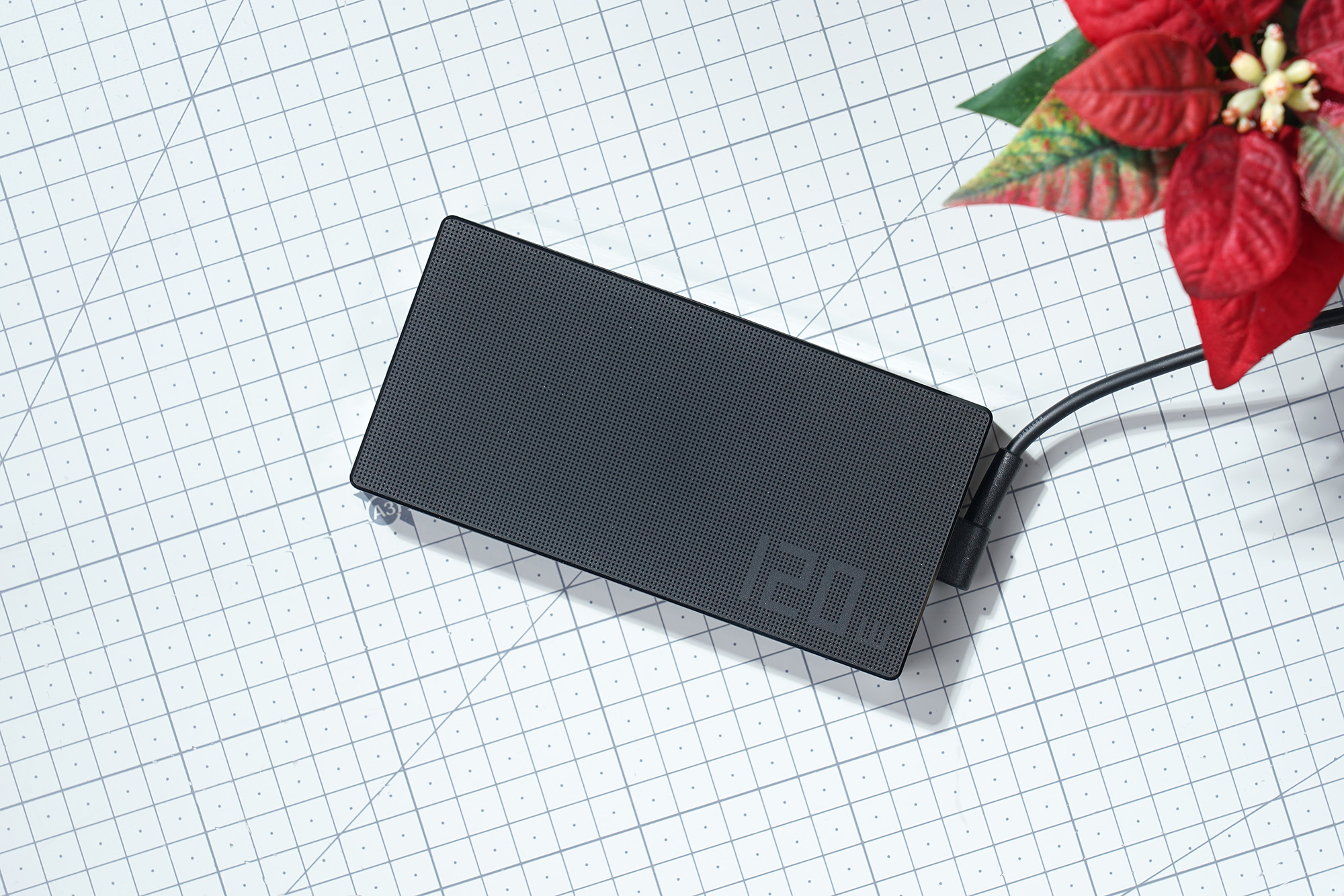 어댑터는 외장형으로 설계되었는데요. 외부에 독특한 격자 형태의 패턴과 함께 120W 출력을 제공한다는 것을 알려주는 문구가 각인되어 있습니다. 그리고 스펙을 살펴보면 프리볼트 입력과 함께 20V, 6A 120W 출력을 제공한다는 것을 확인할 수 있습니다.