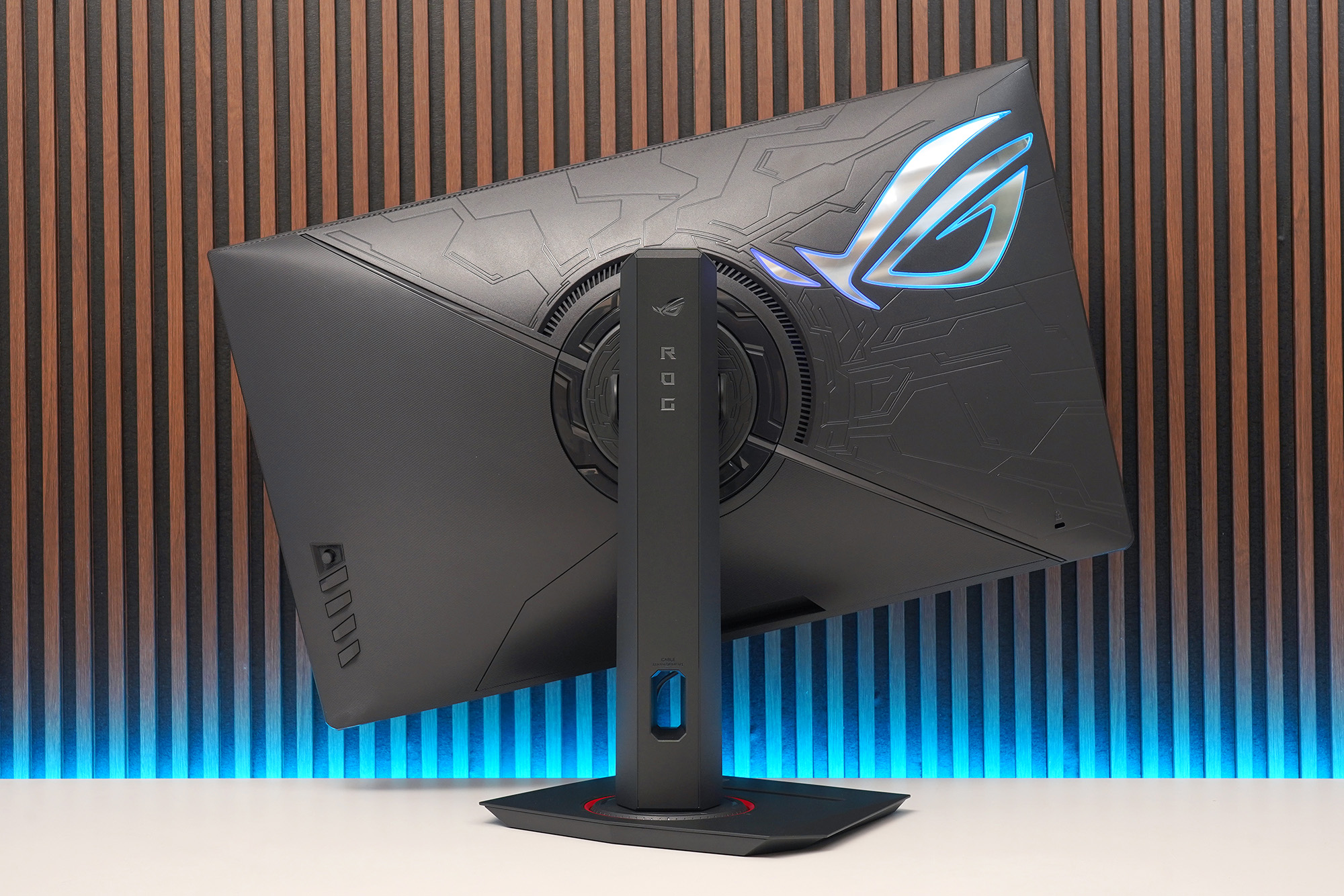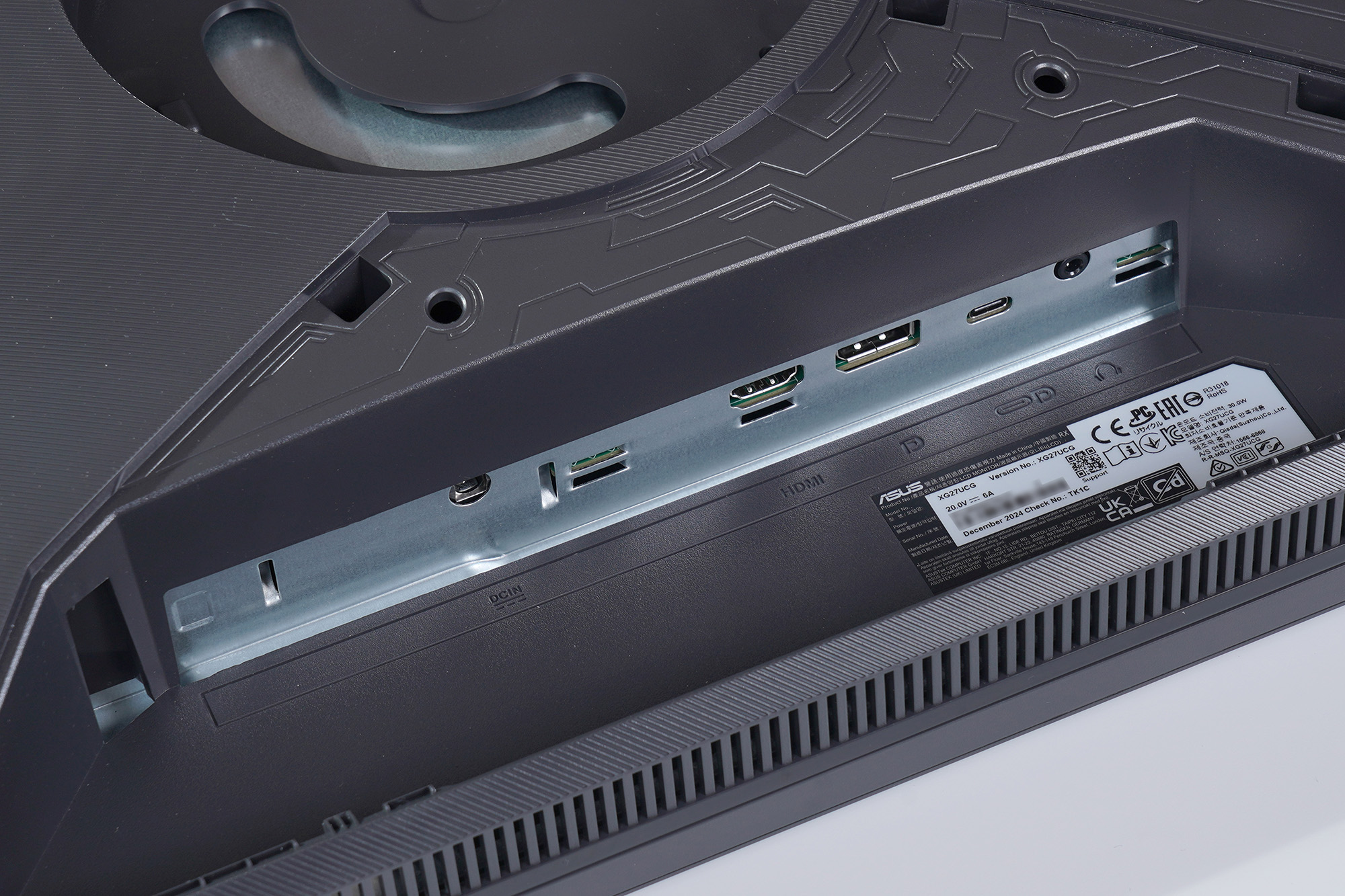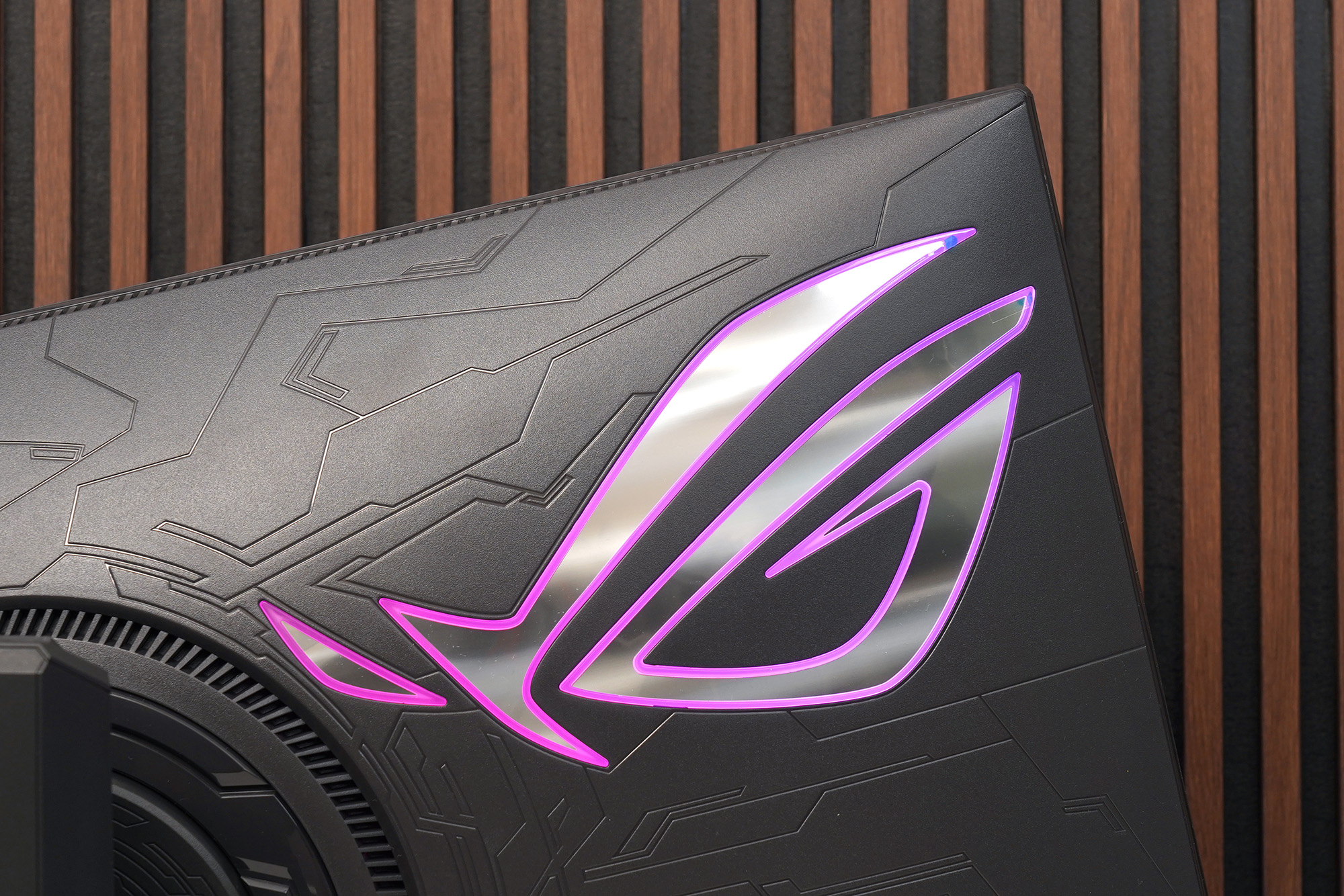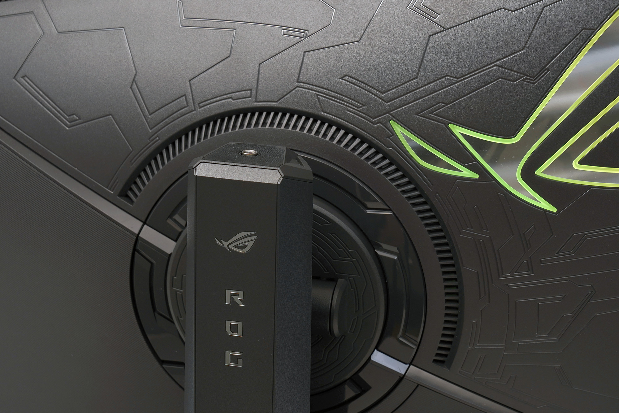 ASUS ROG STRIX XG27UCG 모니터의 뒷면은 상당히 세련된 스타일로 디자인되어 있습니다. 그리고 ROG 로고에 Aura Sync와 연동되는 RGB LED가 내장되어 있는데요. 디자인적인 완성도를 높여주는 요소이고 역시 OSD를 통해서 켜고 끌 수 있습니다.