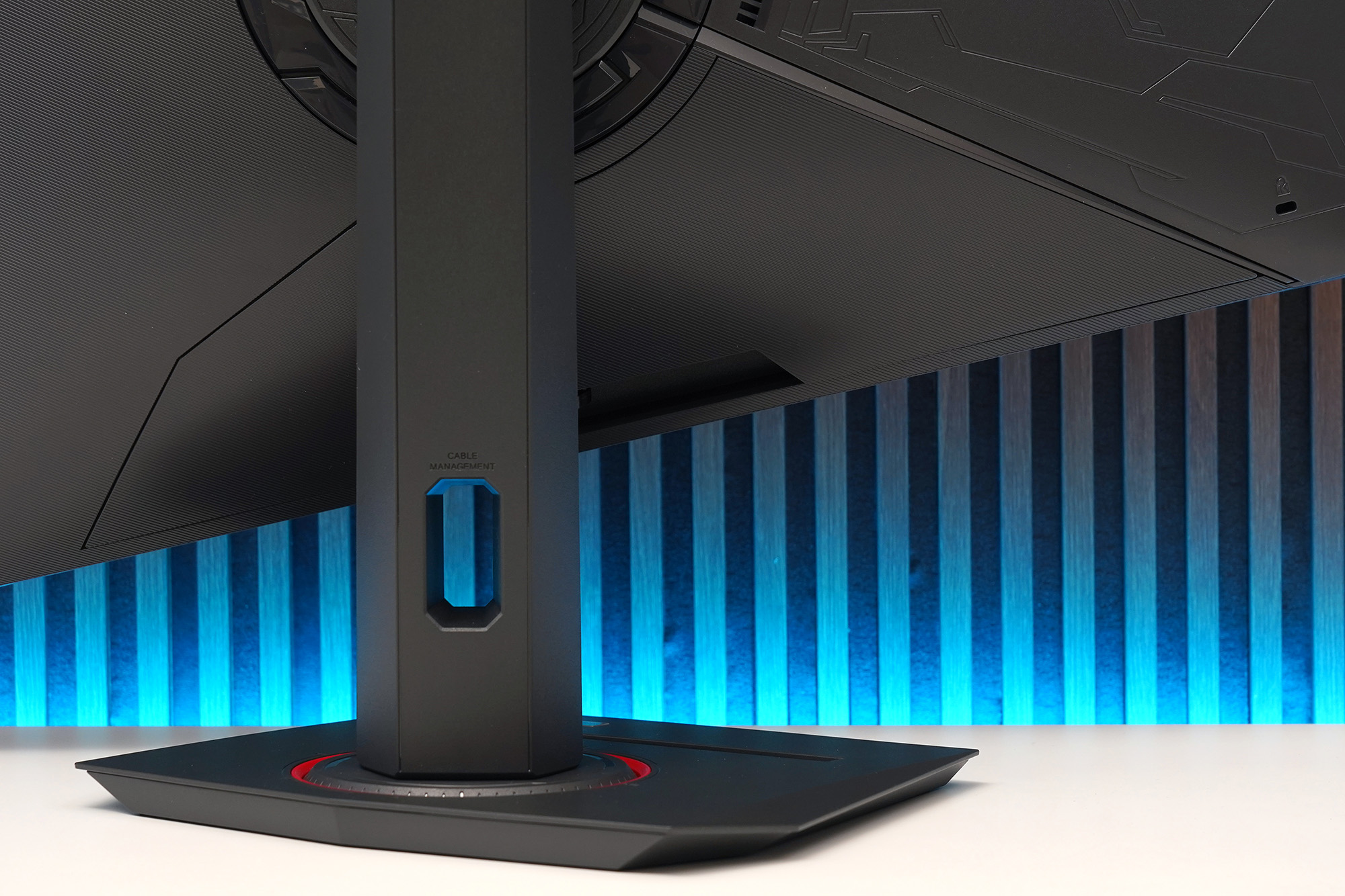 ASUS ROG STRIX XG27UCG 모니터 스탠드의 뒤쪽을 살펴보면 케이블을 정리할 수 있는 별도의 구멍이 배치되어 있는데요. 약간이나마 책상 위를 깔끔하게 만들어줄 수 있습니다.