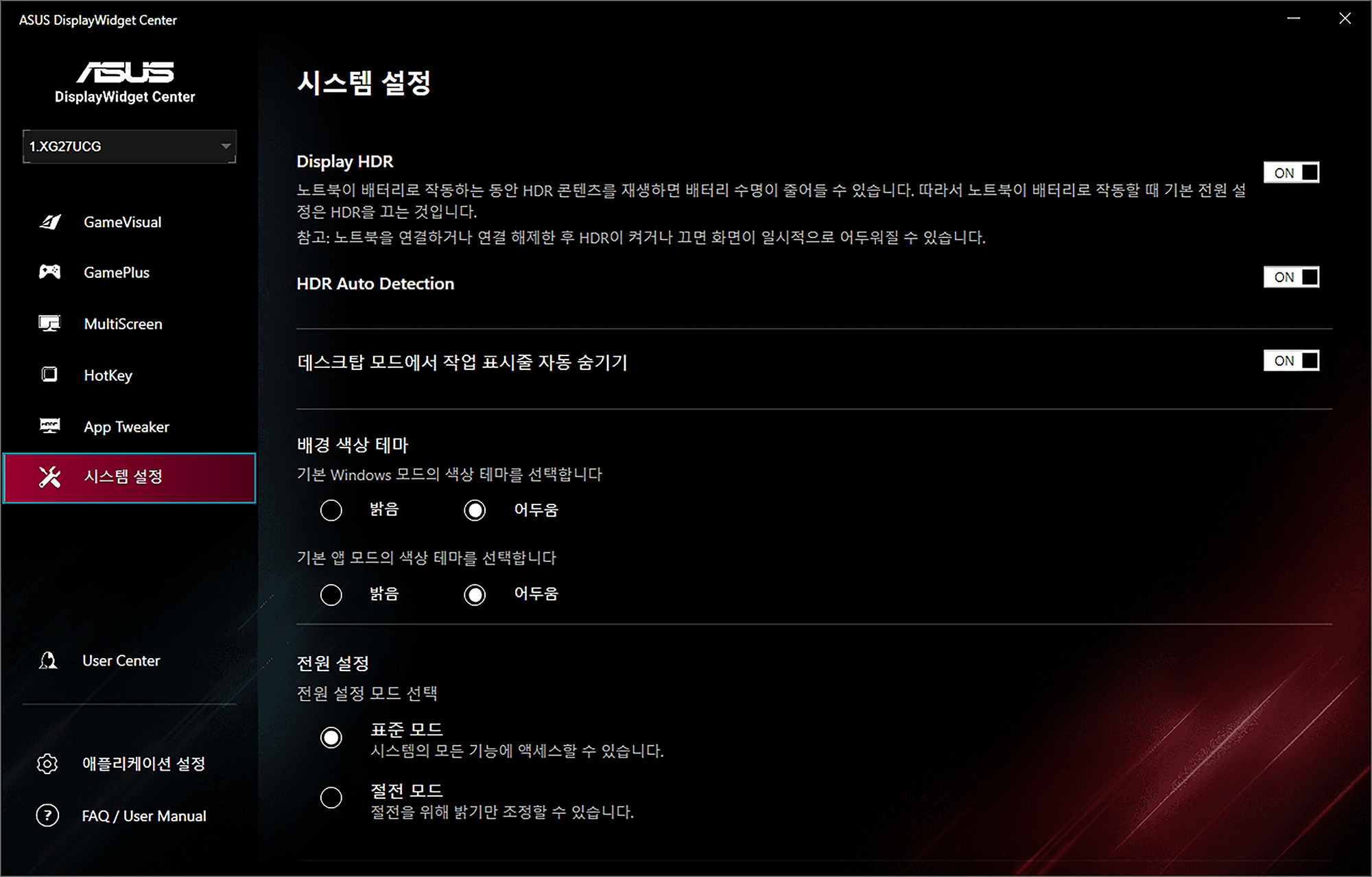 앱 트위커(App Tweaker)에서는 특정 앱이 실행될 때 자동으로 화면의 모드 변경되도록 설정할 수 있는데요. 상당히 유용한 기능이라고 생각되었습니다. 그리고 시스템 설정에서 HDR이나 자동 숨기기 그리고 테마를 변경할 수 있는 기능도 탑재되었습니다.