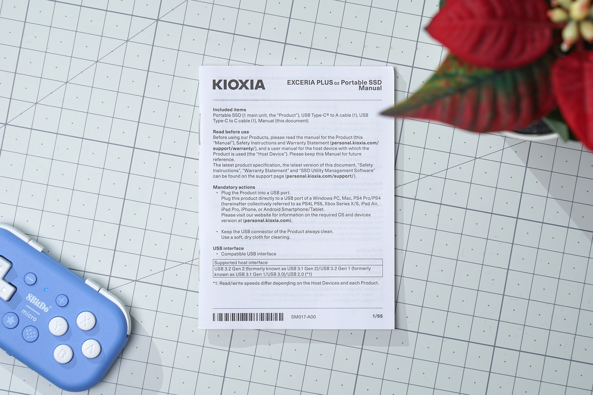 구성품을 살펴보면 매뉴얼이 한 장 포함되어 있습니다. 외장 SSD들의 사용 방법이 어려운 편은 아니지만 한 번 정도는 자세하게 읽어 보는 것이 좋을 것 같습니다. 그런데 제품에 흠집이 생기는 것을 방지해주는 파우치가 포함되어 있지 않다는 점은 조금 아쉬운 부분입니다.