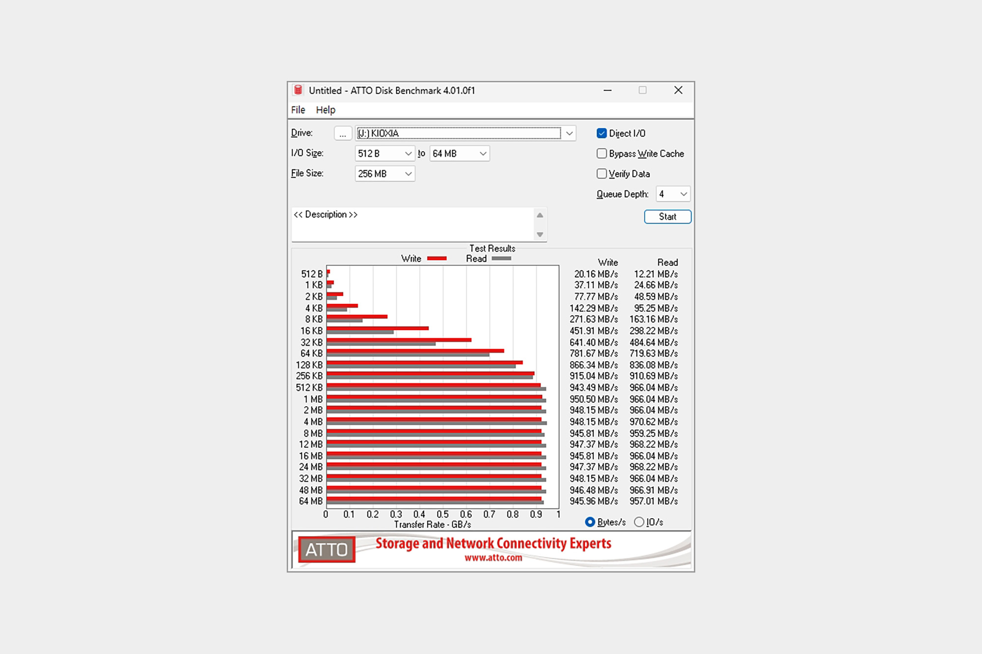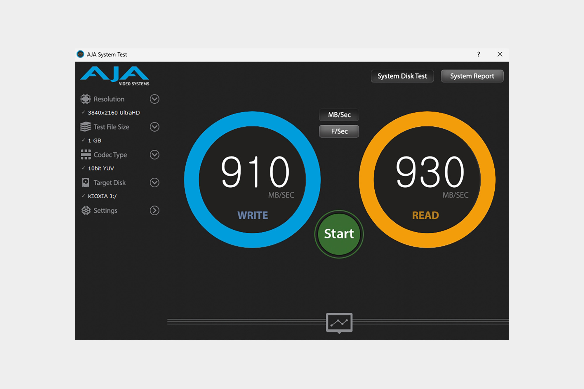 ATTO Disk Benchmark에서 파일 크기에 따른 속도 차이를 확인해 보면 512KB 정도부터 64MB까지 일정한 속도를 보여주는 것을 확인할 수 있습니다. 그리고 AJA VIDEO SYSTEMS에서는 쓰기 910MB/s, 읽기 930MB/s 정도가 측정되었습니다. 전체적으로 무난한 성능을 보여주고 있다는 것을 확인할 수 있습니다.