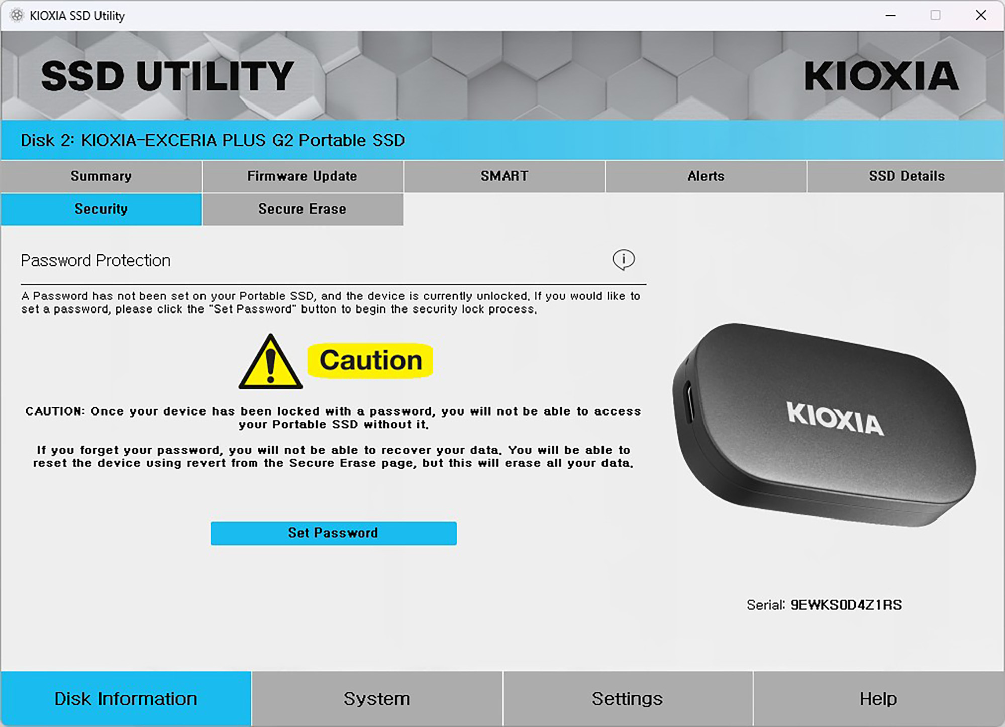 SSD UTILITY에서 제가 유용하다고 생각했던 기능은 바로 시큐리티입니다. 비밀번호 입력 없이는 키옥시아 PLUS G2 외장 SSD가 시스템에 마운트되지 않도록 도와주는 역할을 하는데요. 보안이 중요한 분들에게 유용한 옵션입니다. 그리고 안전하게 데이터를 삭제할 수 있는 기능도 제공하는데요. 참고로 SSD는 HDD와 비교해서 상대적으로 데이터를 복구하기 어렵습니다. 그래서 사용할 때 주의해 주어야 합니다.