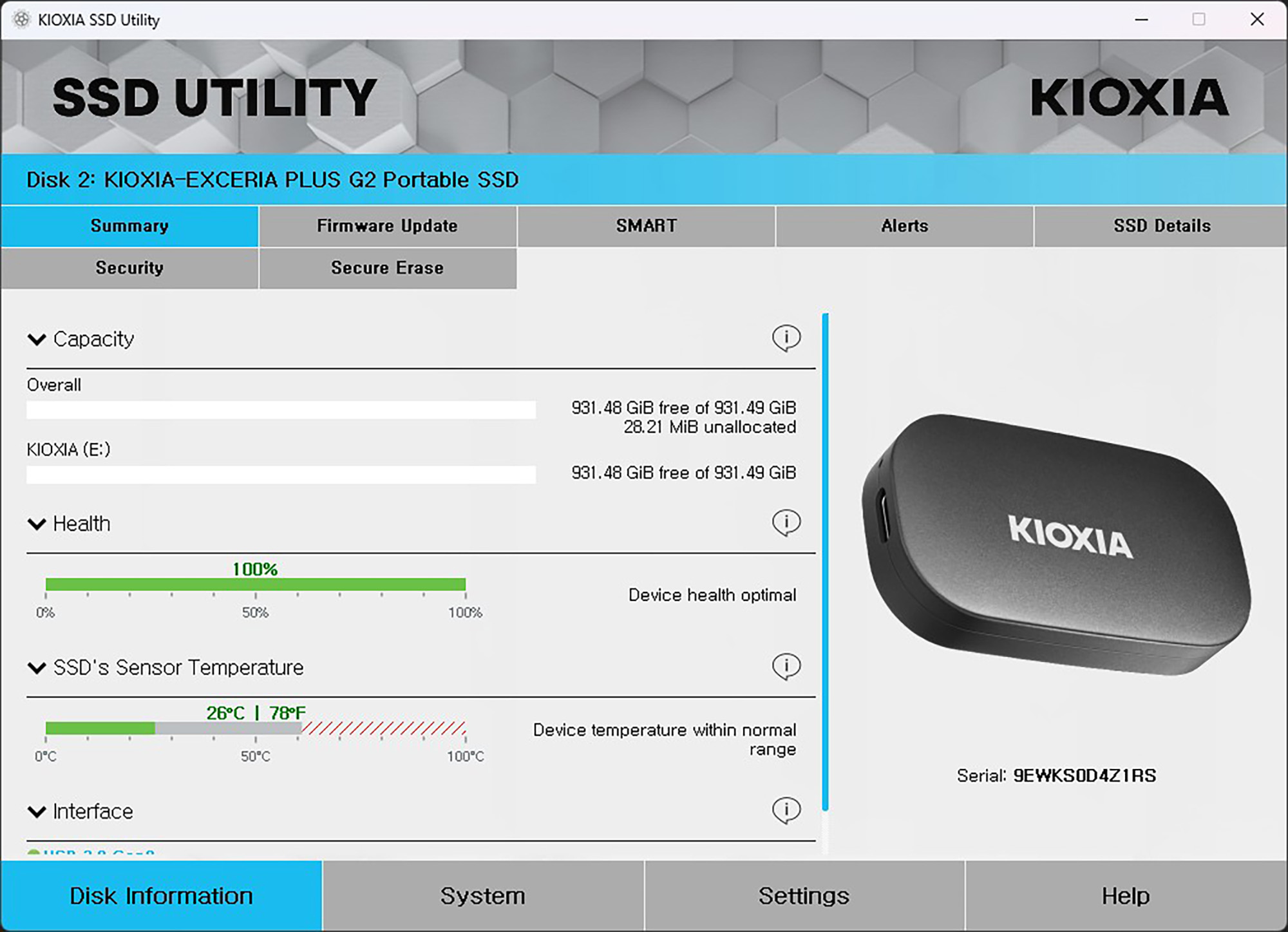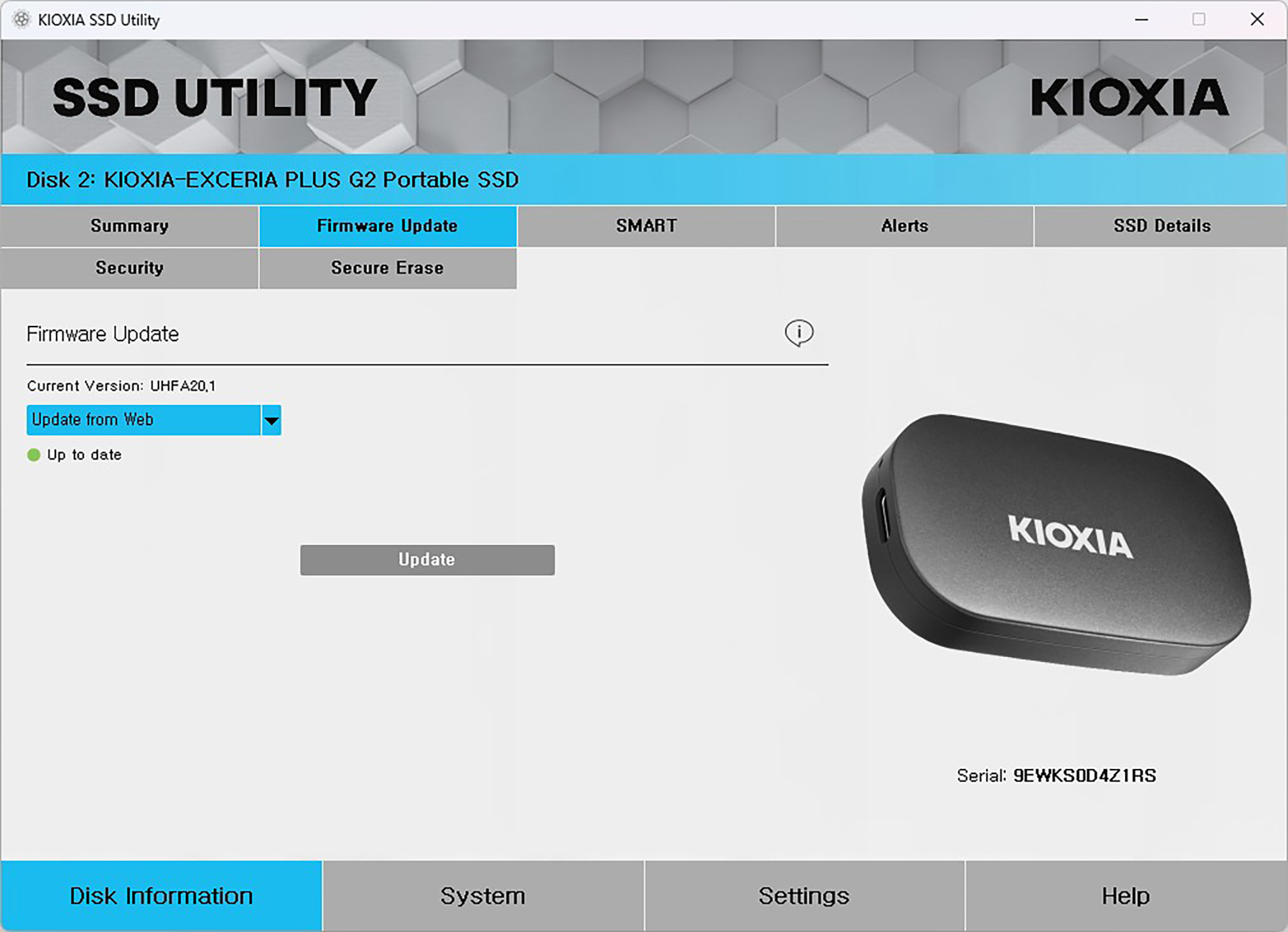 키옥시아 PLUS G2 외장 SSD는 SSD UTILITY라는 전용 소프트웨어를 제공합니다. 현재 상태를 확인할 수 있는 것은 물론이고 펌웨어를 업데이트할 수 있는 기능도 준비되어 있습니다.