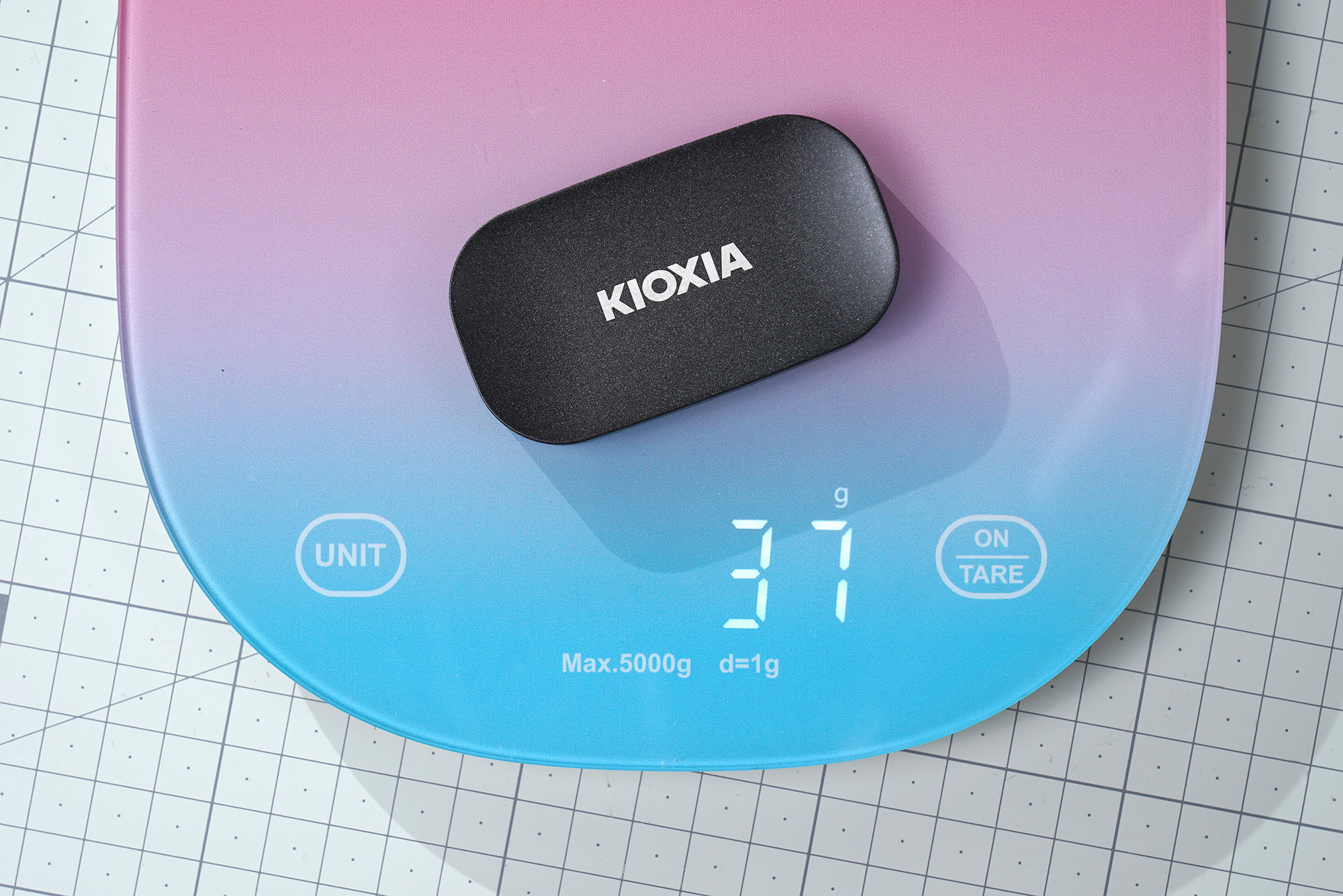 키옥시아 PLUS G2 외장 SSD는 알루미늄 하우징으로 제작되었는데요. MIL-STD 낙하 테스트와 호환될 정도로 내구성이 우수한 편입니다. 그리고 크기는 72.0 x 40.0 x 11.8mm이고 무게는 약 37g으로 부담 없이 휴대할 수 있다는 특징이 있습니다. 다양한 환경에서 데이터를 저장하고 공유해야 하는 분들에게 유용한 특징이라고 할 수 있습니다.