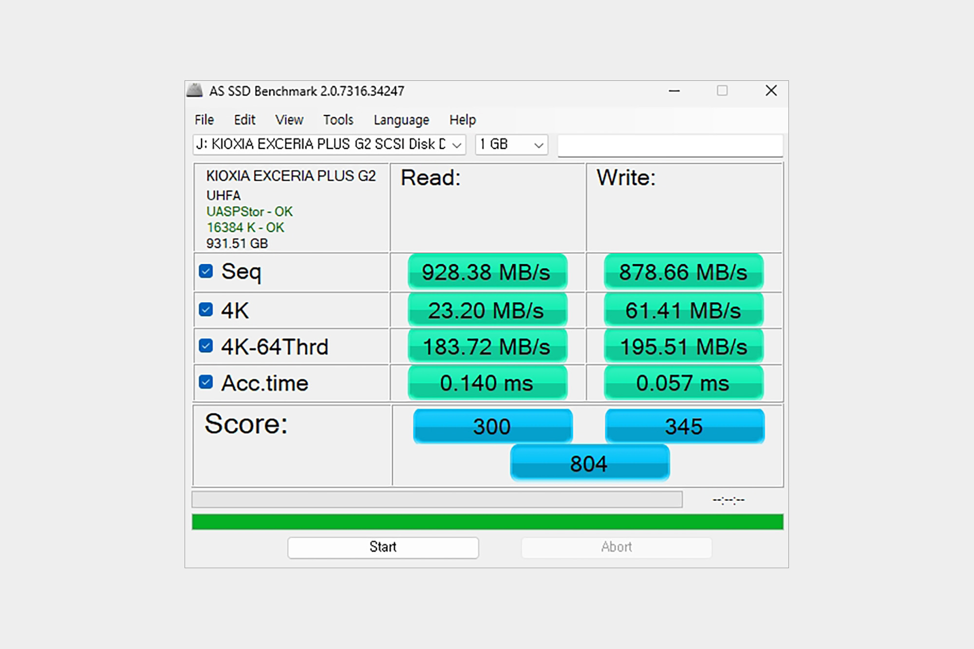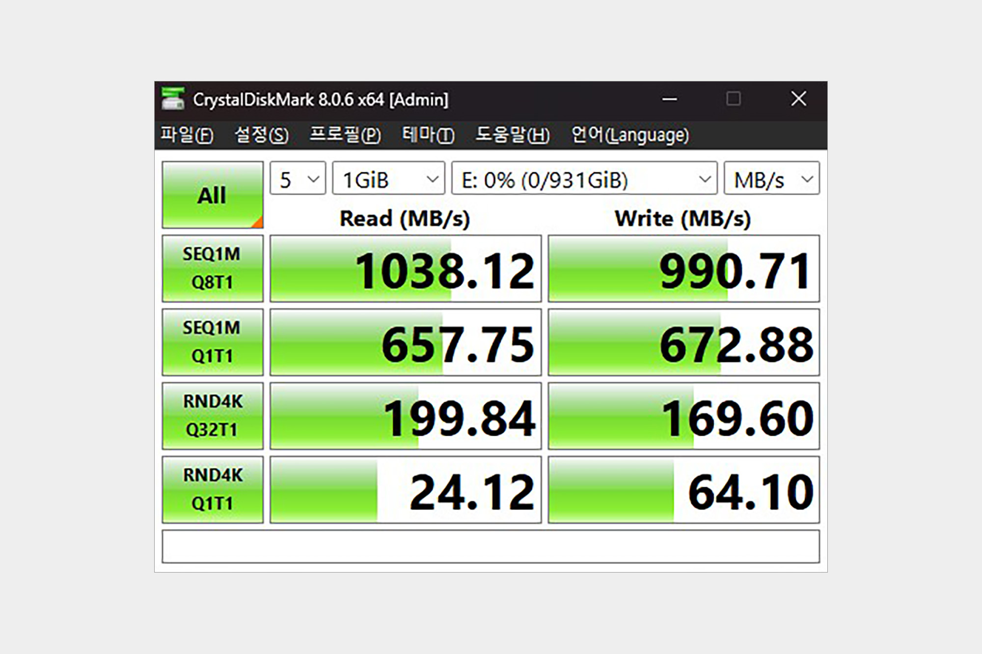 USB 3.2 Gen2를 지원하는 컴퓨터에 키옥시아 PLUS G2 외장 SSD를 연결하고 크리스탈 디스크 마크(ㅊ굔ㅅ미야나ᅟᅳᆷ가 8.0.6)를 통해서 성능을 확인해 보면 읽기는 1038MB/s, 쓰기는 990MB/s 정도 측정되는 것을 확인할 수 있습니다. 그리고 AS SSD Benchmark는 조금 낮은 수치인 읽기 928MB/s, 쓰기 878MB/s 정도 측정되었습니다.