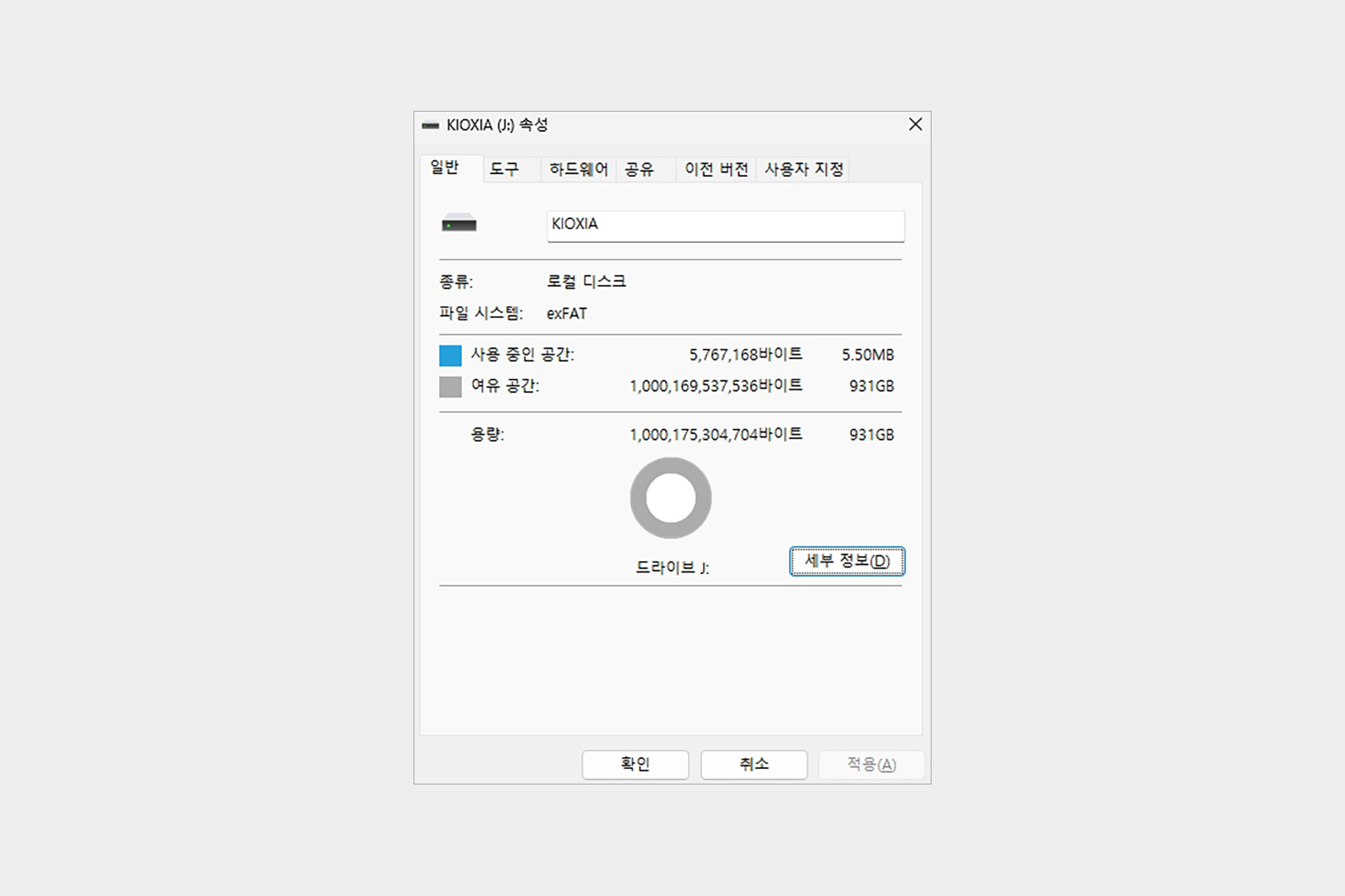 키옥시아 PLUS G2 외장 SSD를 컴퓨터에 연결하고 속성을 확인해 보면 exFAT 파일 시스템으로 포맷되어 있는데요. 여러 장치에서 지원되어서 호환성이 좋은 편입니다. 그리고 용량은 운영체제와 스토리지 제조사의 계산 방식의 차이로 인해서 931GB로 표시됩니다.