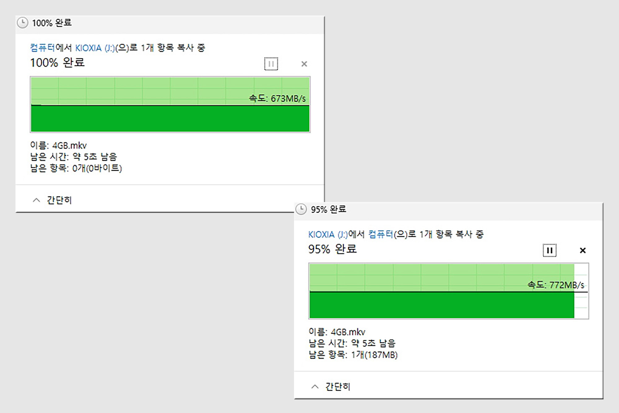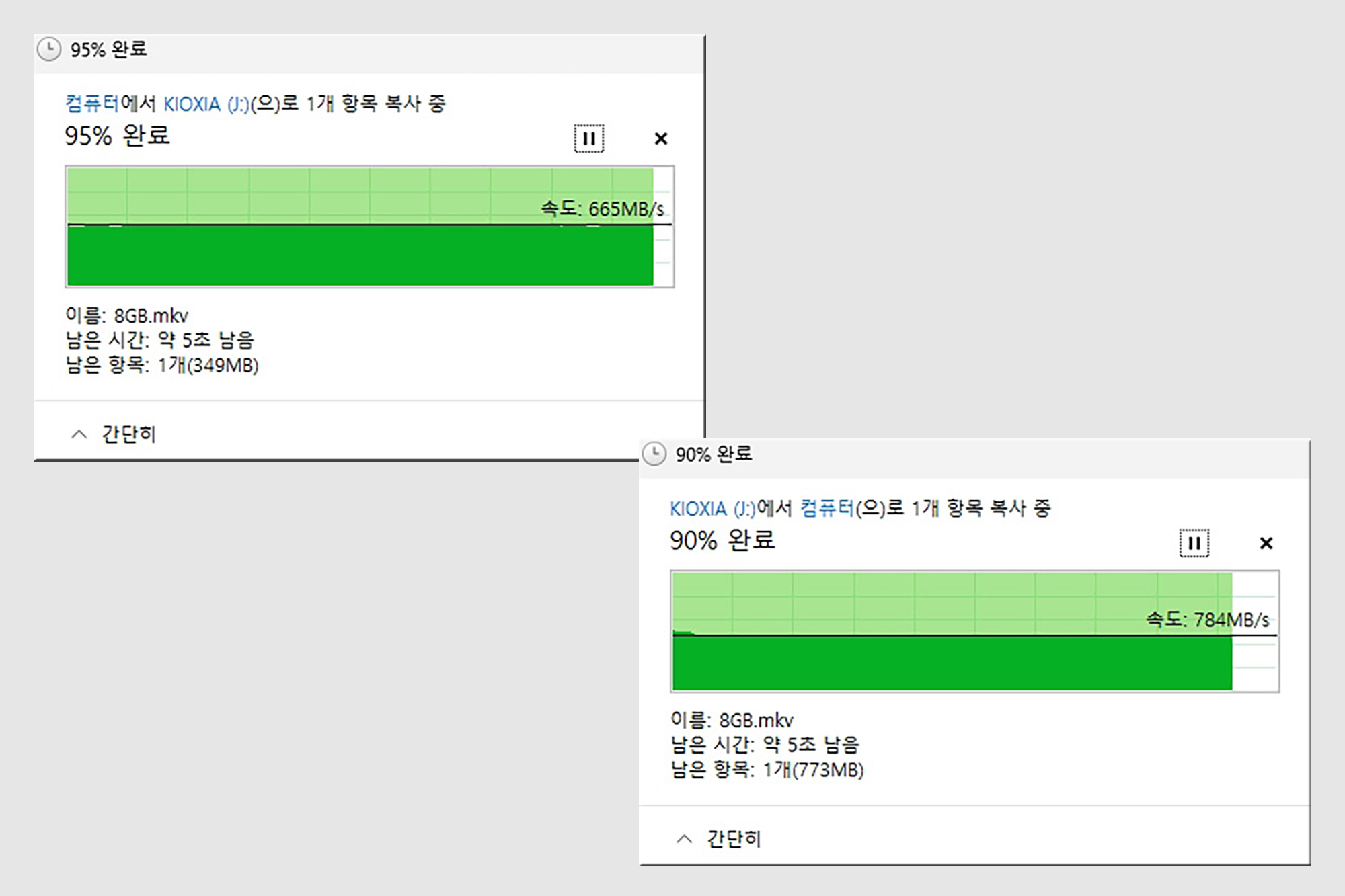 실제로 많이 활용되는 4GB와 8GB 용량의 단일 파일을 이용해서 쓰기와 읽기 속도를 확인해 보면 쓰기는 660~670MB/s 읽기는 770~780MB/s 정도가 측정되었습니다. 단일 파일의 전송 속도는 좋은 편이라고 생각되었습니다.