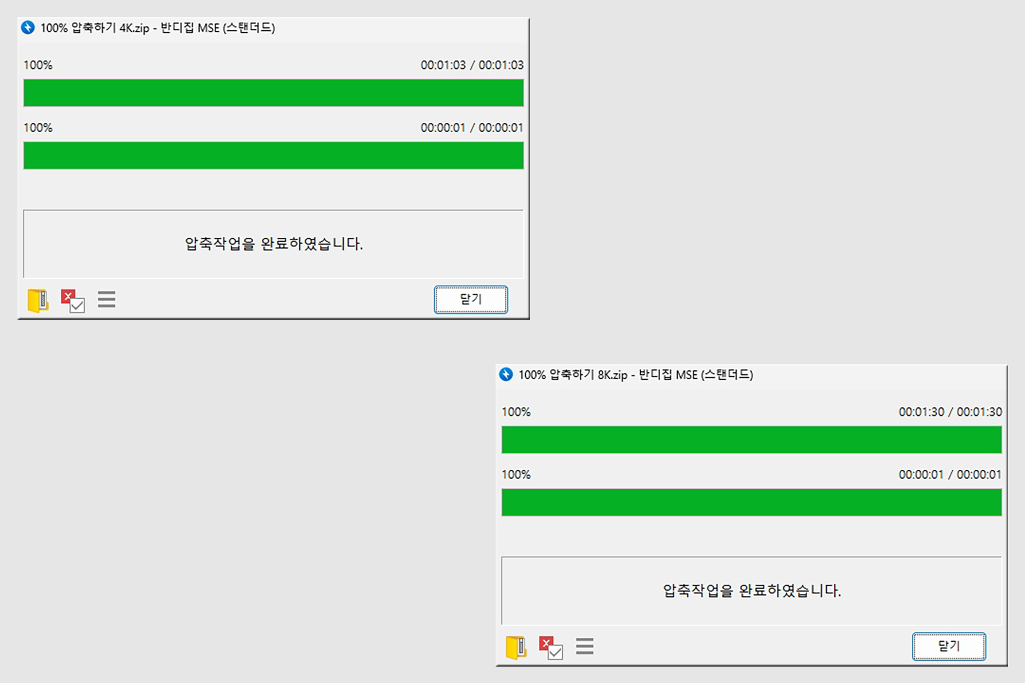그리고 키옥시아 PLUS G2 외장 SSD에서 1MB 용량의 파일을 약 4,000개와 8,000개 정도를 압축해 보면 시간은 약 1분 3초와 1분 30초 정도가 소요되었습니다. 일반적인 작업용으로 활용하기에 부족하지 않아 보였습니다.