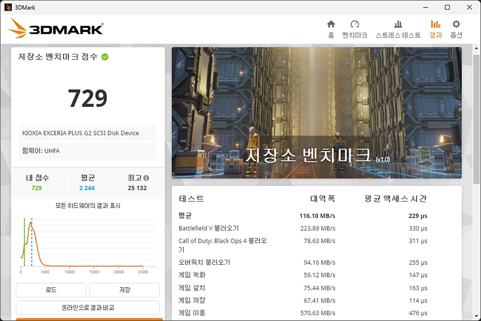 3DMARK에 포함된 저장소 벤치마크 기능을 활용해 보면 점수는 729점이 측정되었습니다. 그리고 평균 대역폭은 116MB/s 정도였고 평균 액세스 시간은 229마이크로초로 측정되었습니다. SSD이기 때문에 HDD와 비교해서 액세스 타임이 상당히 빠른 것을 확인할 수 있습니다.