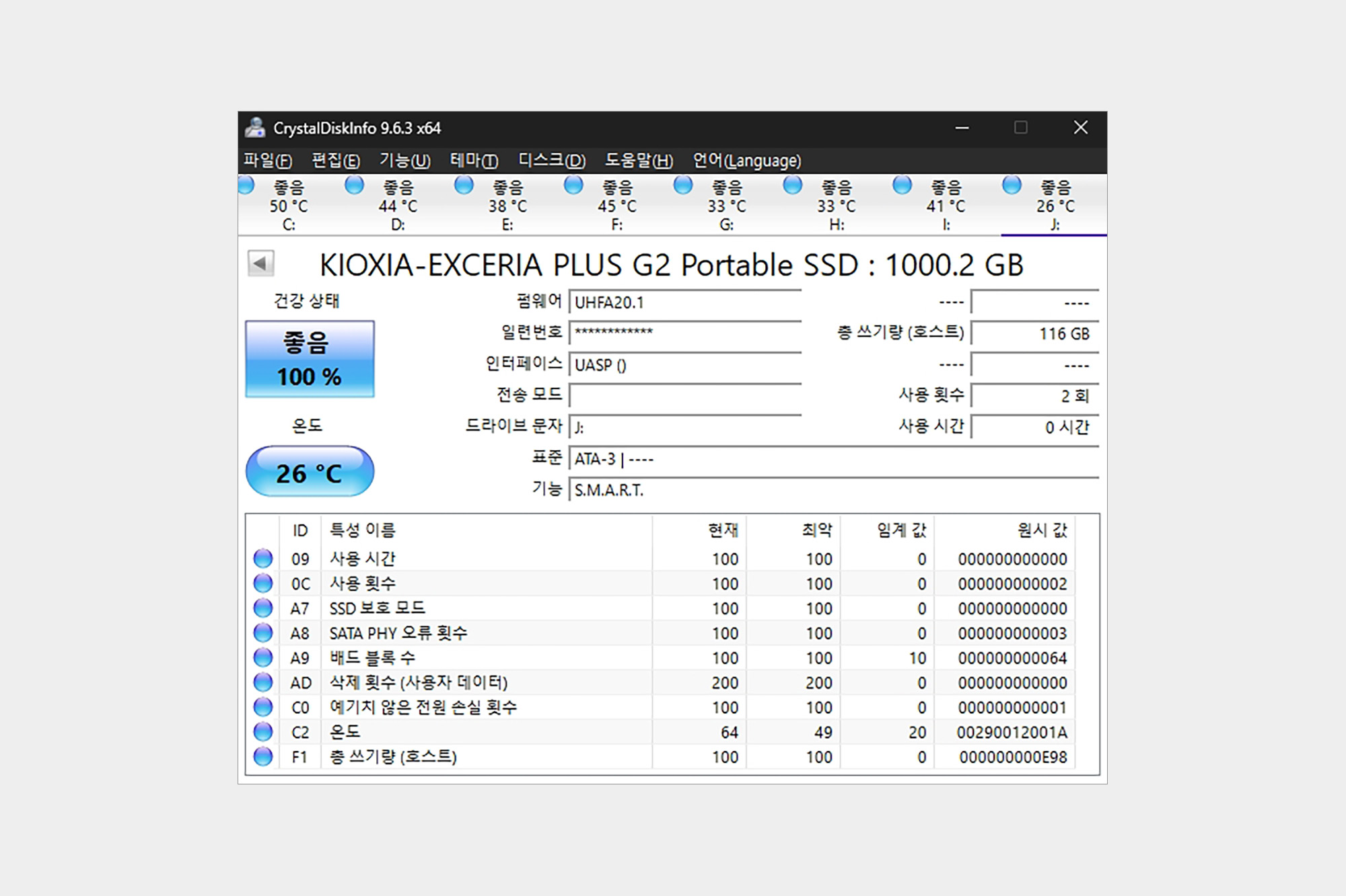 크리스탈 디스크 인포(CrystalDiskInfo)를 이용해서 키옥시아 PLUS G2 외장 SSD의 정보를 확인해 보면 총 쓰기량과 사용 횟수 그리고 시간 등을 확인할 수 있습니다. 참고로 펌웨어 버전은 UHFA20.1입니다.