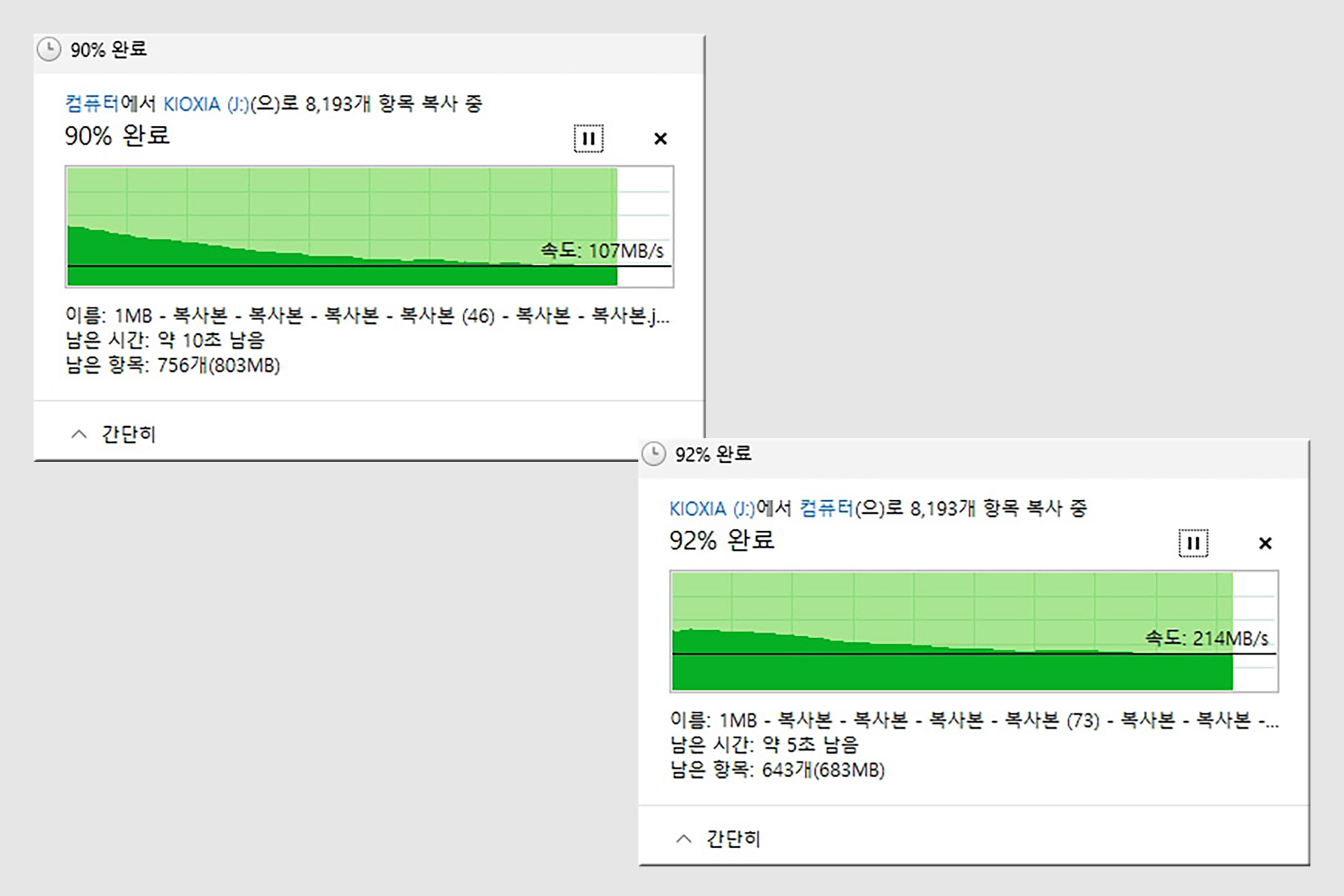 그리고 1MB 용량의 파일 약 4,000개와 8,000개를 전송해 보면 쓰기는 약 107~140MB/s 정도가 측정되었고 읽기는 214~244MB/s 정도가 측정되었습니다. 파일의 숫자가 많고 용량이 작을수록 속도가 떨어지는 것을 확인할 수 있습니다.