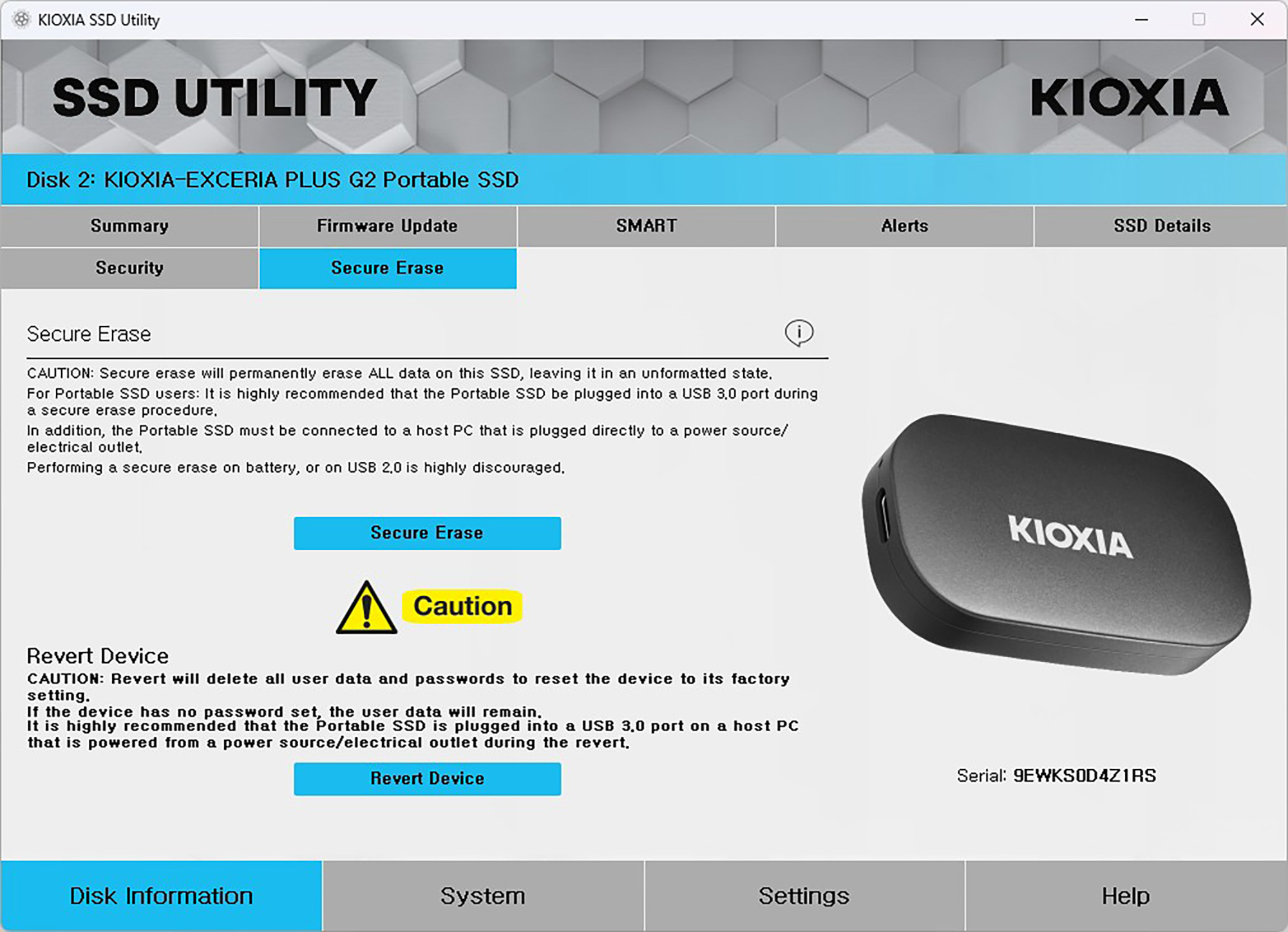 키옥시아 PLUS G2 외장 SSD는 SSD UTILITY라는 전용 소프트웨어를 제공합니다. 현재 상태를 확인할 수 있는 것은 물론이고 펌웨어를 업데이트할 수 있는 기능도 준비되어 있습니다.