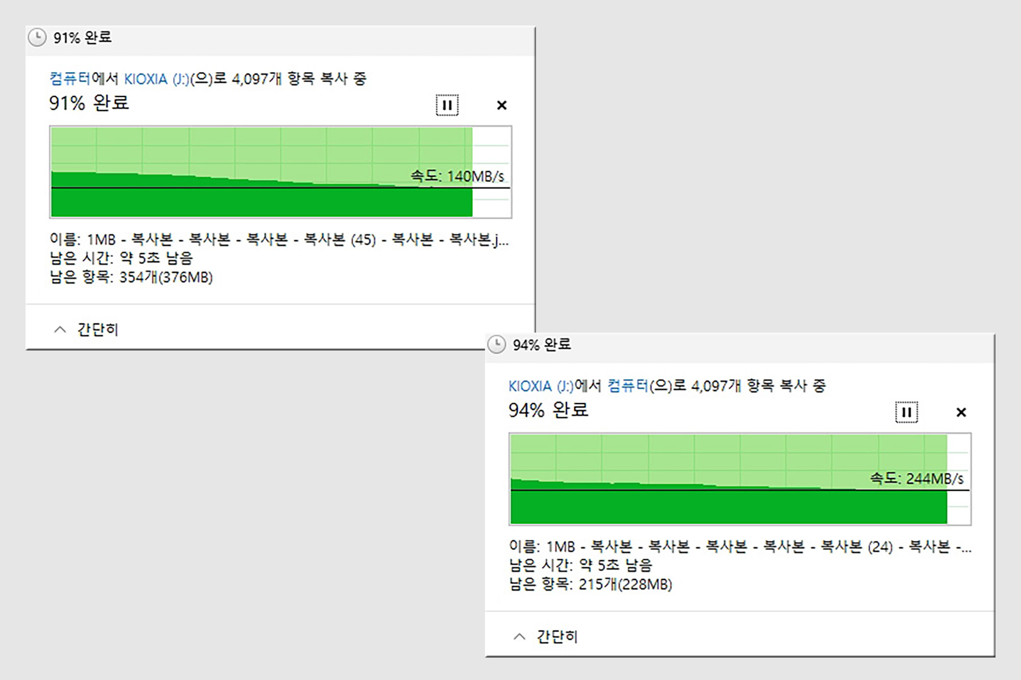 그리고 1MB 용량의 파일 약 4,000개와 8,000개를 전송해 보면 쓰기는 약 107~140MB/s 정도가 측정되었고 읽기는 214~244MB/s 정도가 측정되었습니다. 파일의 숫자가 많고 용량이 작을수록 속도가 떨어지는 것을 확인할 수 있습니다.