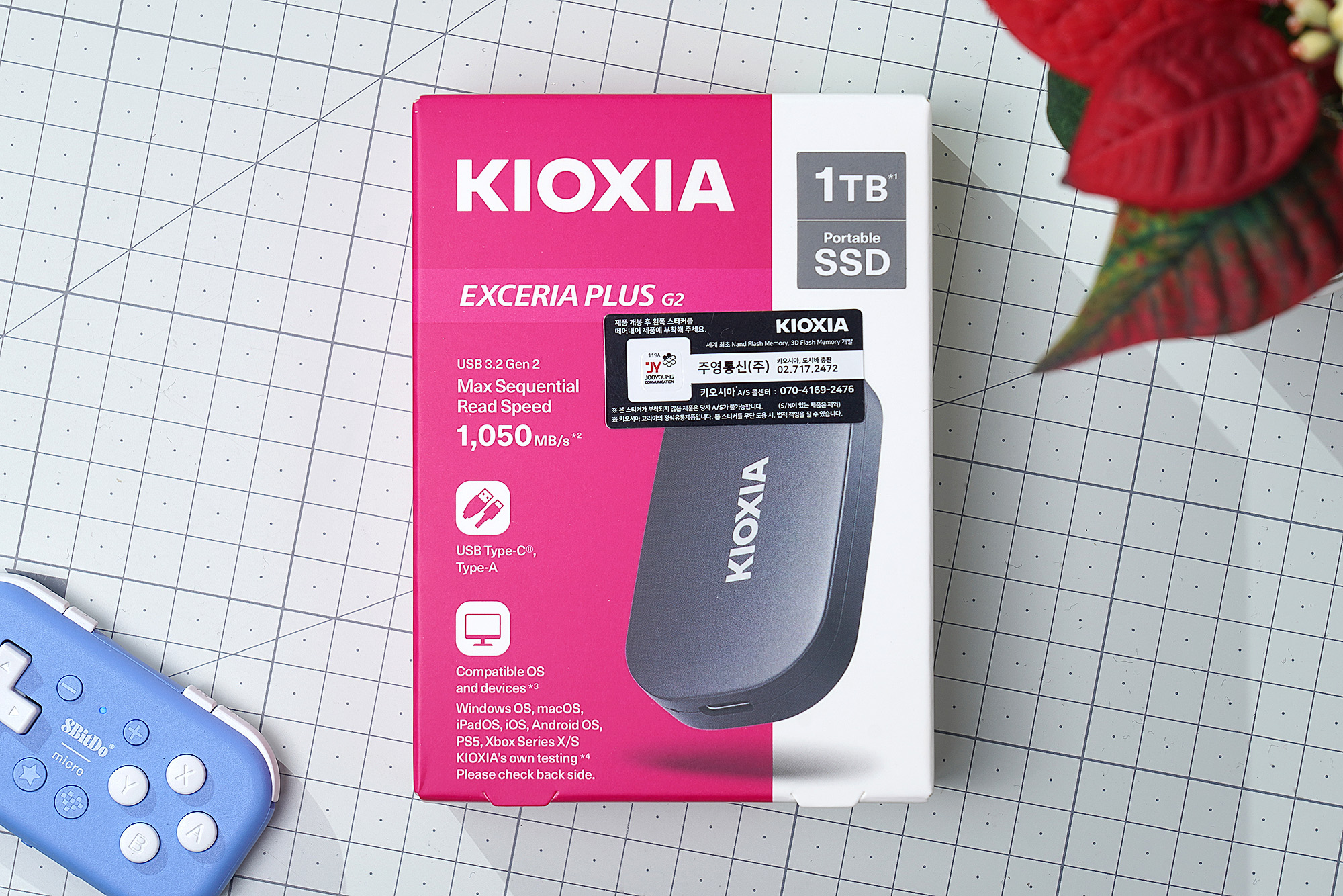 키옥시아 PLUS G2 외장 SSD의 박스를 살펴보면 전면에는 1TB 용량(512GB, 2TB)과 1,050MB/s라는 속도가 표시되어 있습니다. 그리고 한국에는 주영통신(주)라는 곳에 유통하고 있고 A/S를 위해서 스티커를 떼어내어 제품에 부착하라는 내용이 설명되어 있습니다.