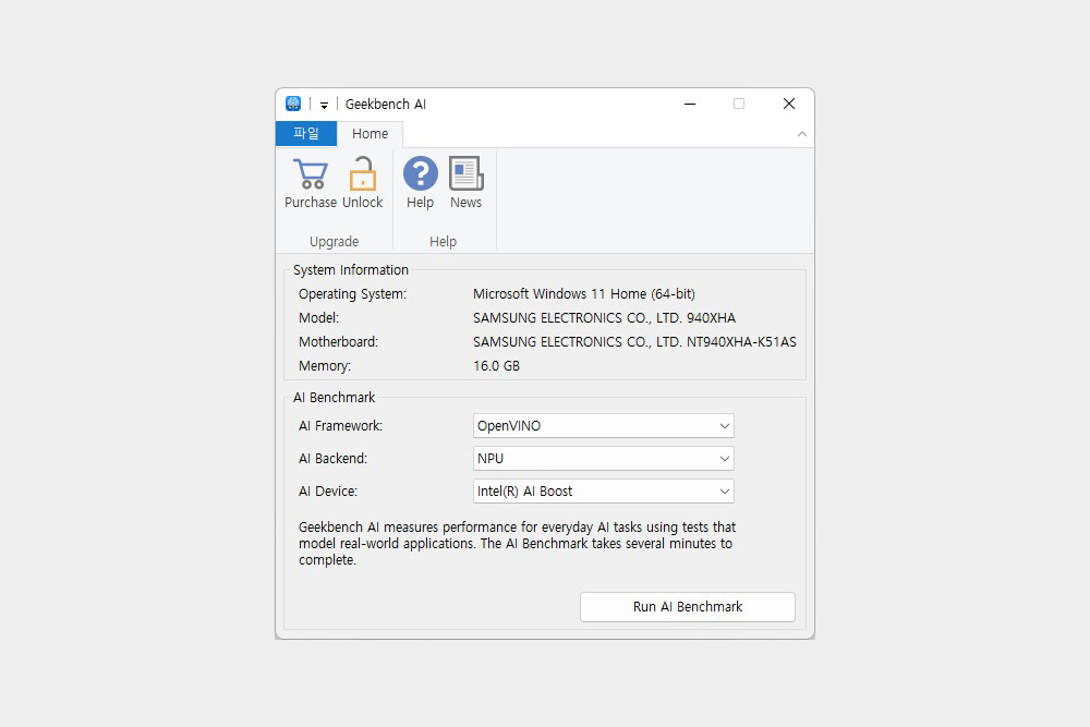 Geekbench 긱벤치 AI 벤치마크 소프트웨어를 설치하면 AI Framework를 선택할 수 있는데요. ONNX에서는 CPU만 선택할 수 있고 OpenVINO를 선택해야지만 NPU가 활성화됩니다. 필요에 따라서 프레임워크와 백엔드를 선택하는 것이 좋을 것 같습니다.
