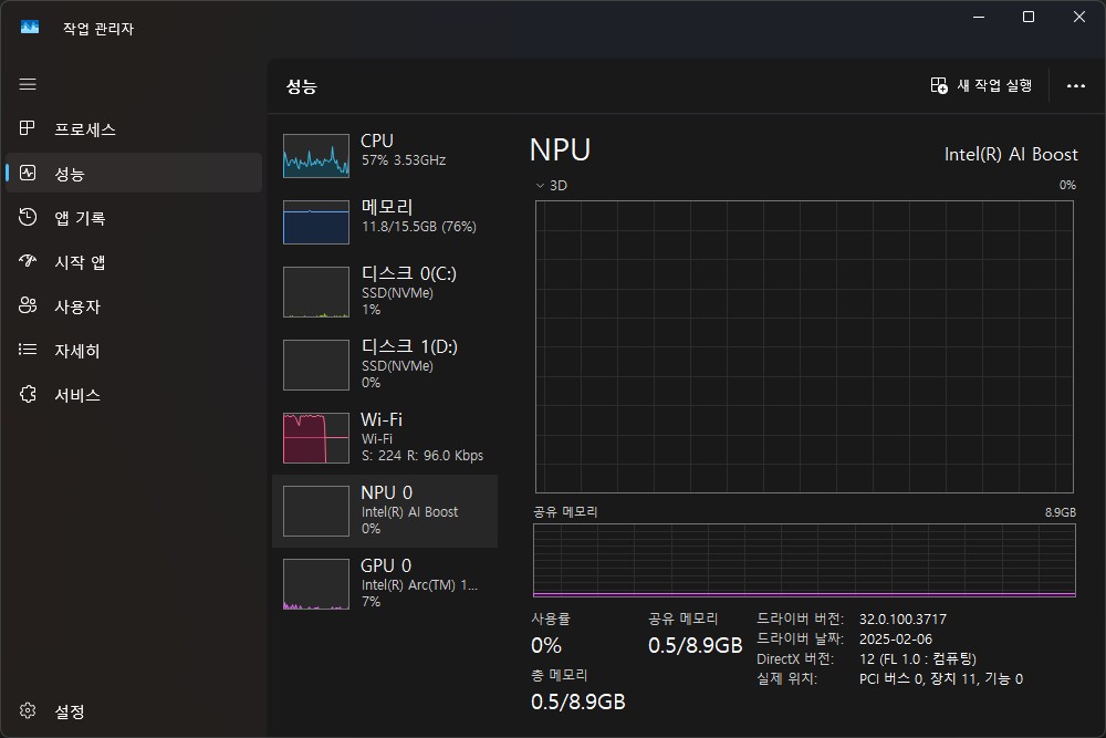 최근에 출시된 인텔 프로세서를 탑재한 노트북에서 작업 관리자를 확인해 보면 CPU와 메모리 등의 정보와 함께 NPU 0 Intel AI Boost라는 항목이 표시되는데요. 일상적인 작업을 할 때 해당 기능이 활성화되는 것은 거의 보기 어렵습니다.