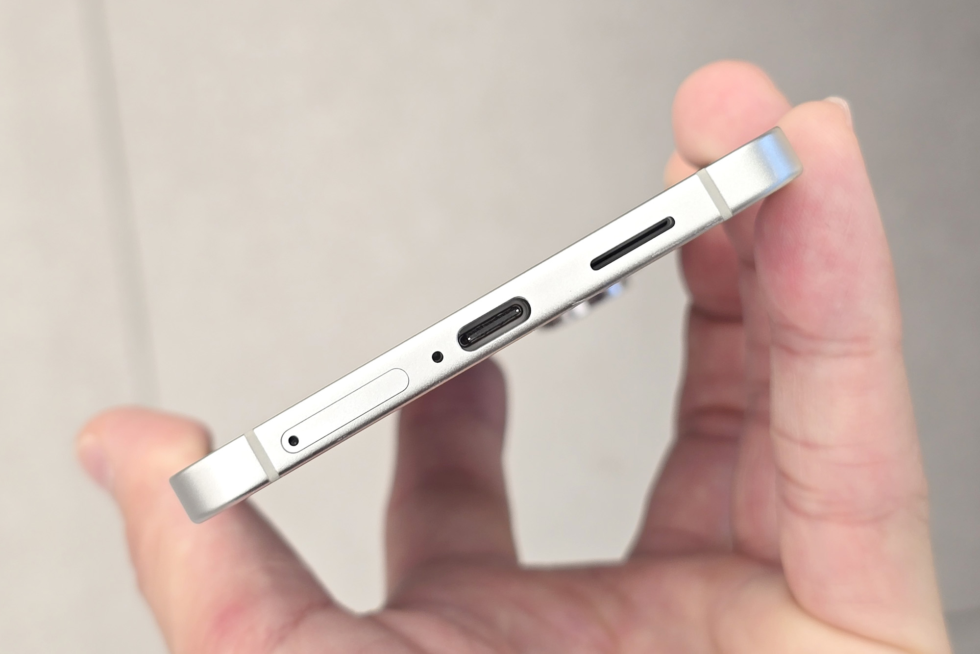 갤럭시 S25 엣지의 아래쪽 단자를 확인해 보면 프레임 자체는 깔끔하게 잘 만들어져 있고 USB-C 포트의 센터가 미묘하게 어긋나 있다는 점이 신경을 거슬리게 만드는 요소입니다. 아무래도 얇은 두께 때문에 기판과 포트의 위치를 조절하기 어려웠던 것으로 보입니다.