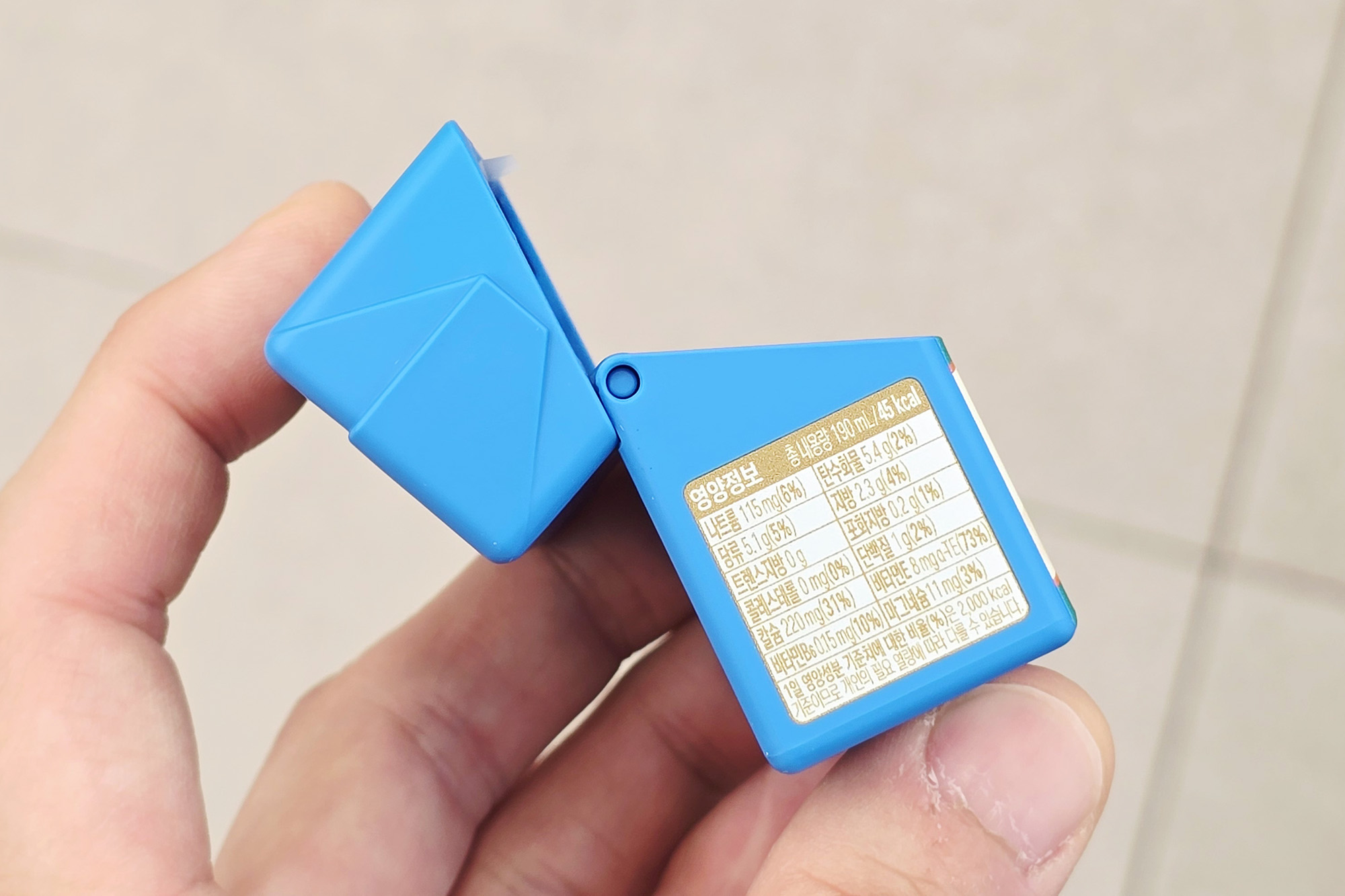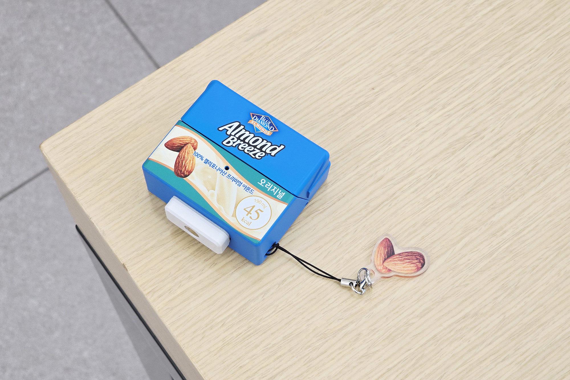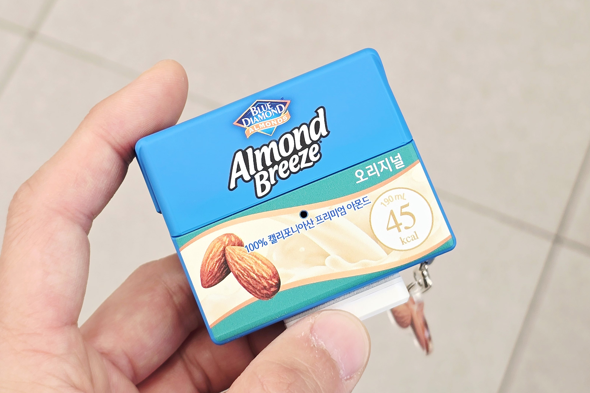 아몬드브리즈 오리지널 케이스를 자세하게 살펴보면 용량이나 칼로리 그리고 유통기한과 영양 정보까지 상당히 구현이 잘되어 있는 것을 확인할 수 있고 앙증맞은 디자인의 아몬드 키링이 부착되어 있습니다. 평소에 다이어티를 위해서 아몬드브리즈를 즐기는 분들이라면 상당히 메리트가 있을 만한 제품이라고 생각되었습니다.