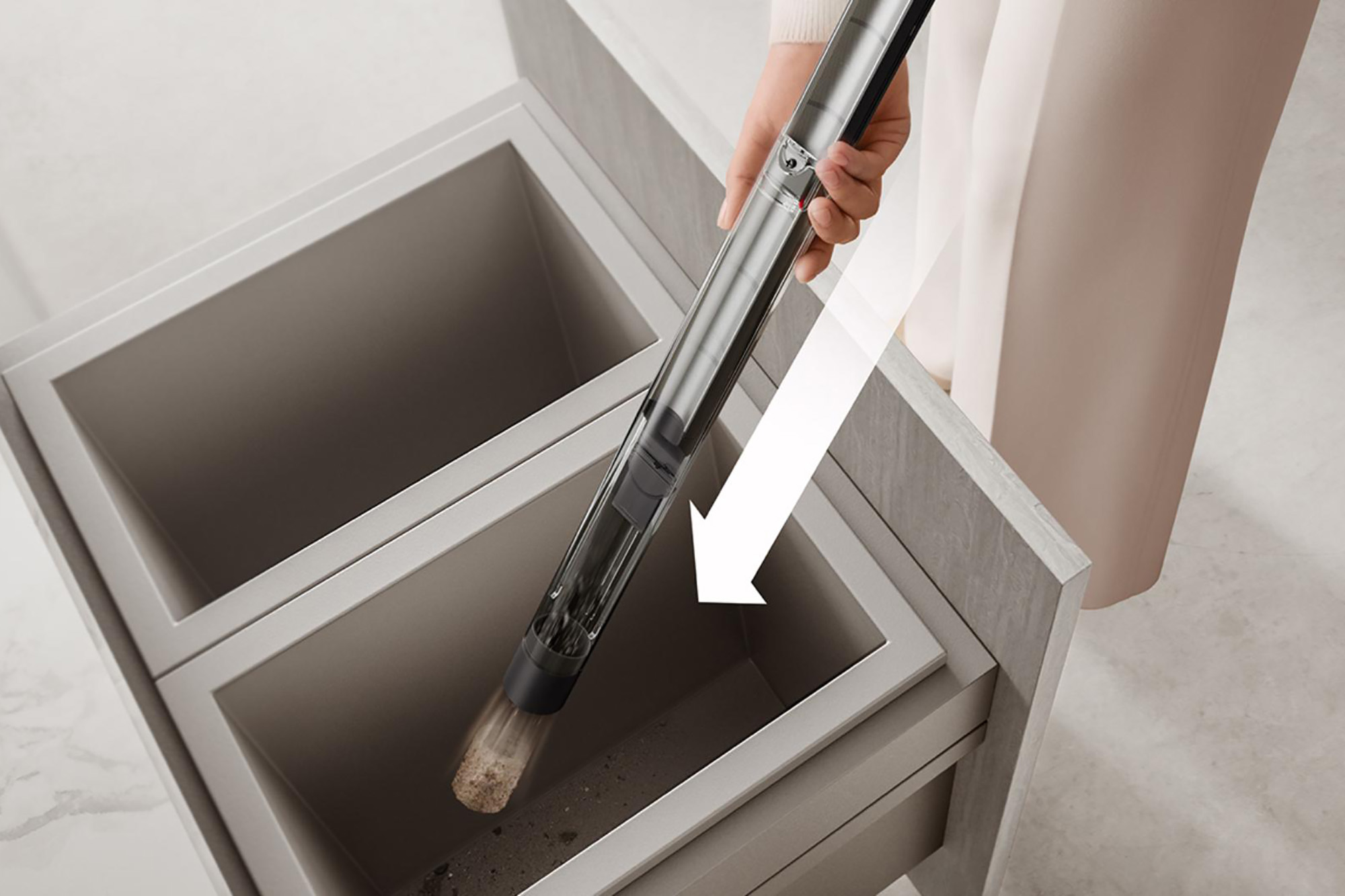 다이슨 펜슬백 플러피 콘 슬림 무선 청소기의 먼지통은 상단에 배치되어 있는데요. 완전히 밀봉되어 있고 필터레이션 시스템으로 인해서 0.3마이크론 크기의 미세먼지를 99.9%까지 걸러낼 수 있다고 합니다. 그리고 새로운 먼지통 배출 시스템이 탑재되어서 압축된 먼지를 밀어 넣어서 배출할 수 있습니다.