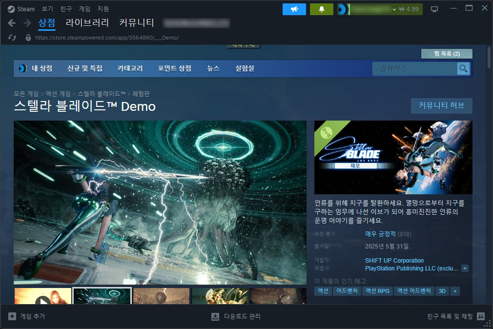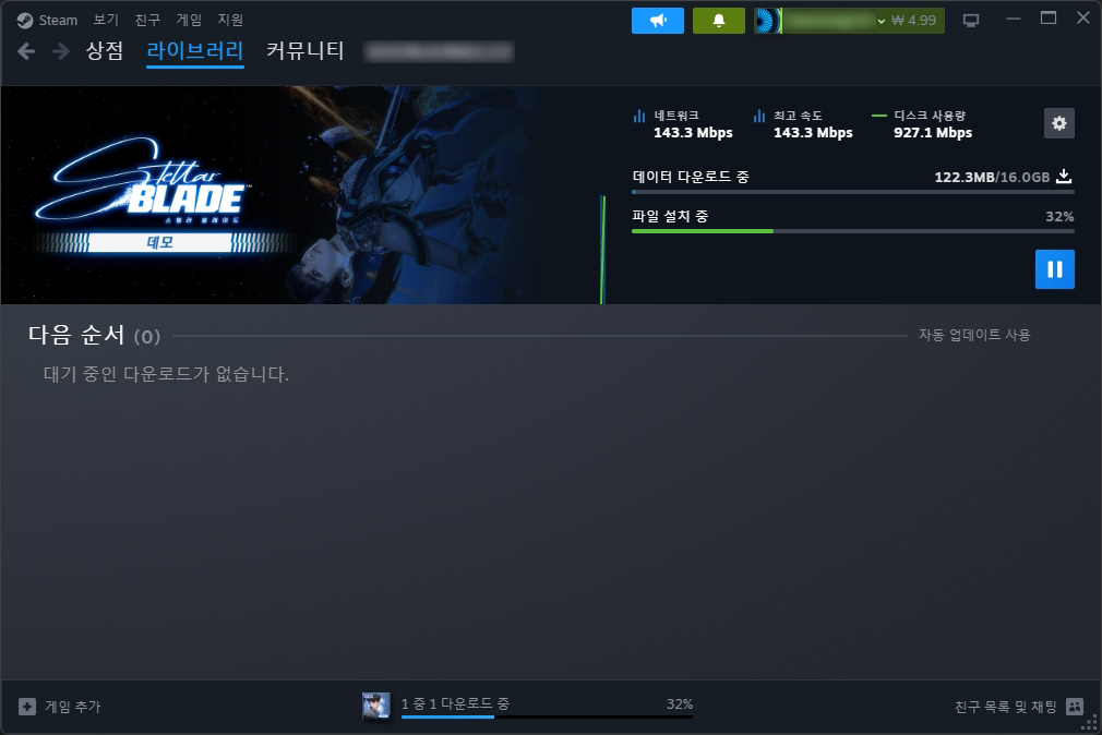 스텔라 블레이드 데모 체험판은 스팀에서 간단하게 다운로드 받고 설치할 수 있는데요. 다운로되는 파일의 크기는 약 16GB 정도이고 자신이 사용하고 있는 인터넷 회선에 따라서 차이가 있겠지만 많은 시간이 소요되지는 않는 편입니다.