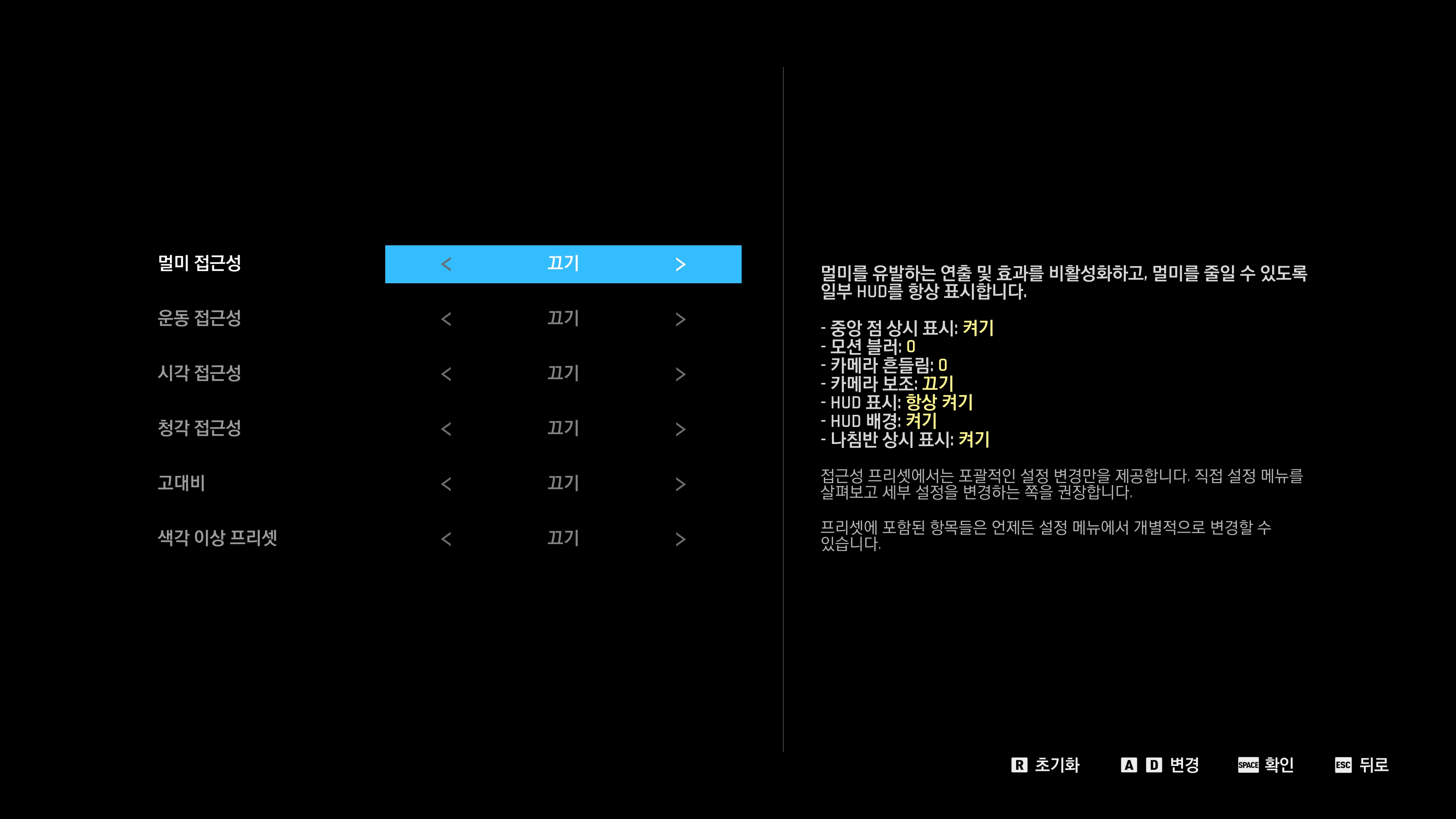 다운로드가 완료되고 스텔라 블레이드 데모 체험판을 실행시키면 문자 언어와 음성 언어가 표시되는 것을 확인할 수 있는데요. 한국회사에서 개발된 제품이라서 당연히 한국어를 지원합니다. 그리고 멀미, 운동, 시각, 청각 접근성 관련 기능들이 준비되어 있는데요. 필요에 따라서 선택적으로 활용해주는 것이 좋을 것 같습니다.