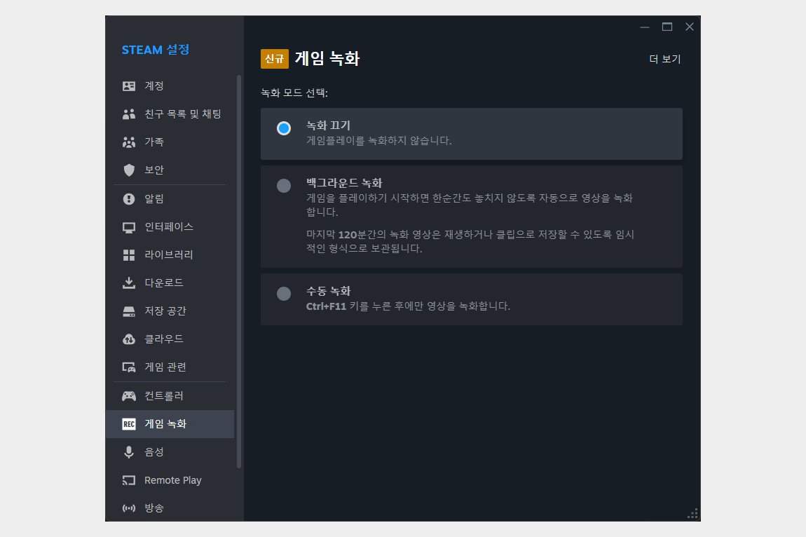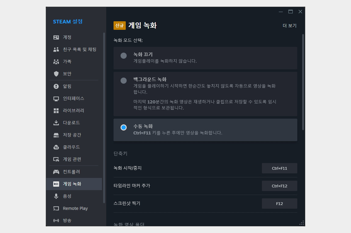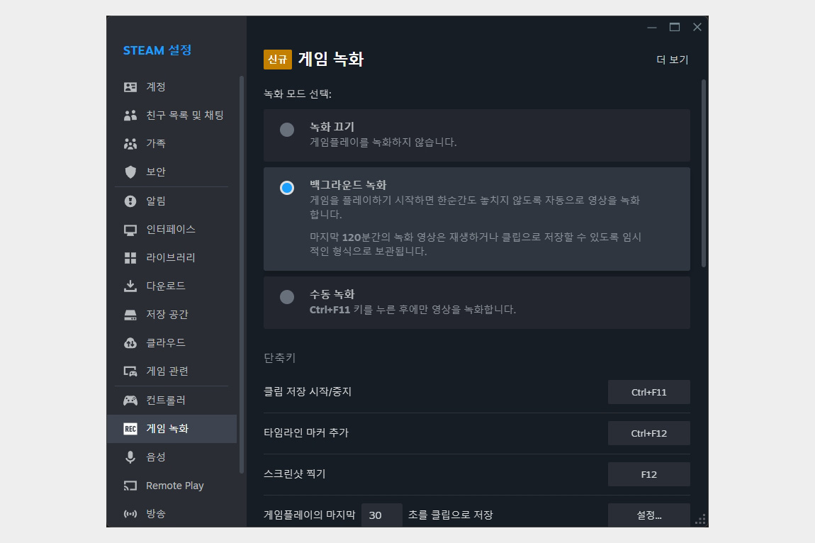 스팀 클라이언트 게임 녹화 설정을 확인해 보면 ”녹화 끄기“와 ”백그라운드 녹화“ 그리고 ”수동 녹화“로 구성되어 있습니다. 그리고 단축키를 살펴보면 클립 저장 시작/중지 Ctrl+F11이고 스크린샷 찍기는 F12입니다. 그외에도 GPU 하드웨어 인코딩 사용과 HEVC(H.265) 비디오 코덱 그리고 최대 프레임 속도, 녹화 영상 폴더 등도 변경할 수 있습니다.