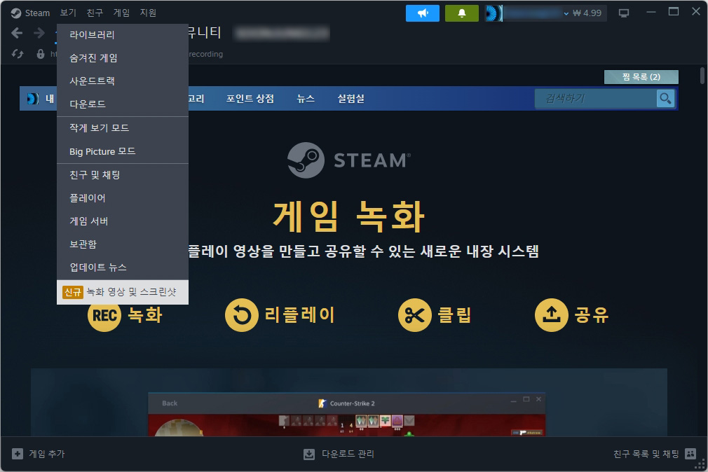우선 게이머라면 대부분 설치되어 있는 스팀 클라이언트를 살펴보면 보기에 신규라는 항목으로 ”녹화 영상 및 스크린샷“이라는 기능이 탑재된 것을 확인할 수 있습니다. 스크린샷 기능은 이전부터 존재했는데요. 이번에 새롭게 녹화 기능이 탑재된 것으로 보입니다.
