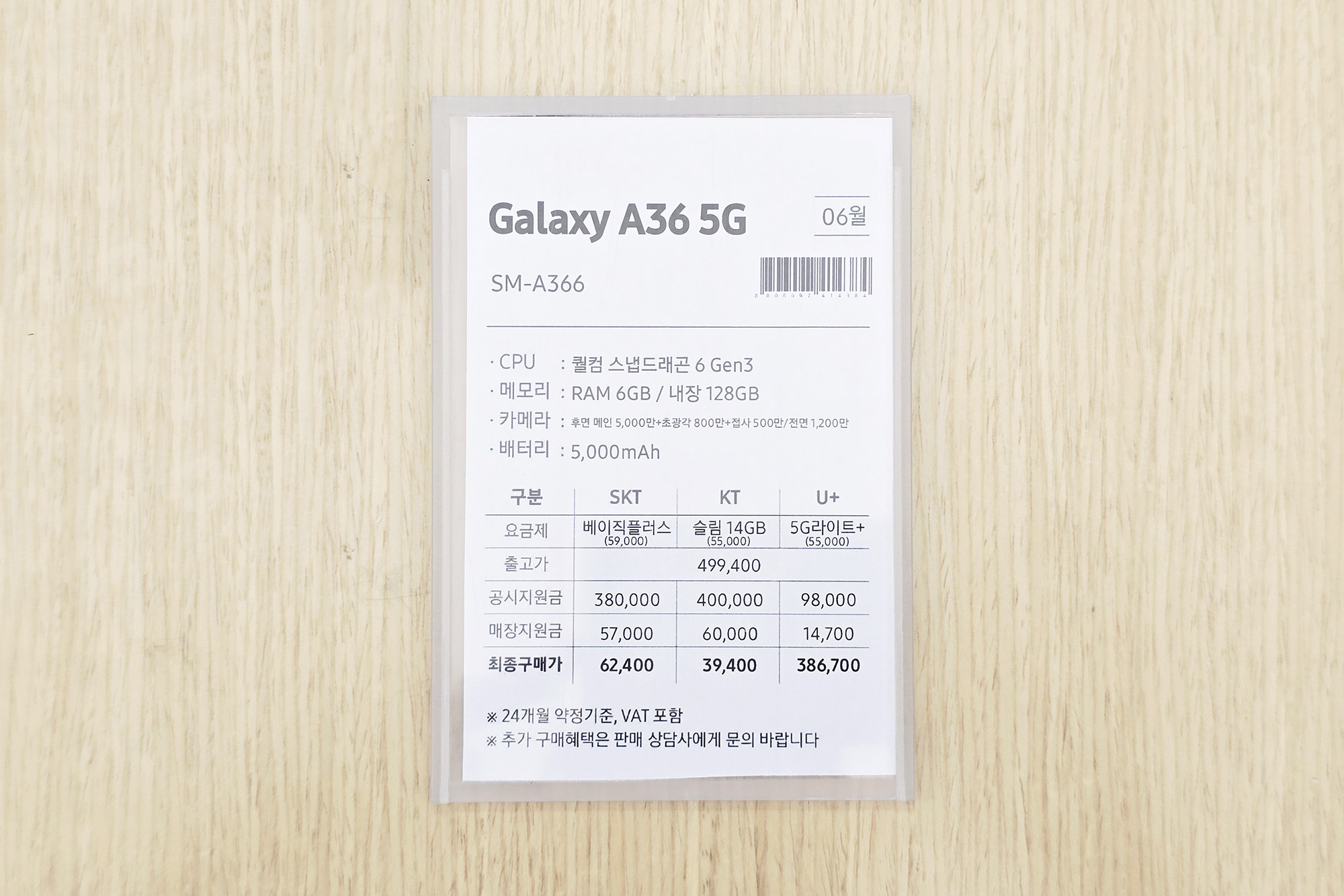 갤럭시 A36 5G의 스펙을 확인해보면 퀄컴 스냅드래곤 6 Gen 3이 탑재되었는데요. 이전 모델인 갤럭시 A35에 탑재되었었던 삼성 엑시노스 1380과 비교해서 성능 향상이 약간(약 5%) 있기는 하지만 체감될 정도는 아닌 편입니다. 그래서 조금 아쉬운 부분입니다. 그리고 출고가는 이전 제품과 동일하게 유지되었습니다.