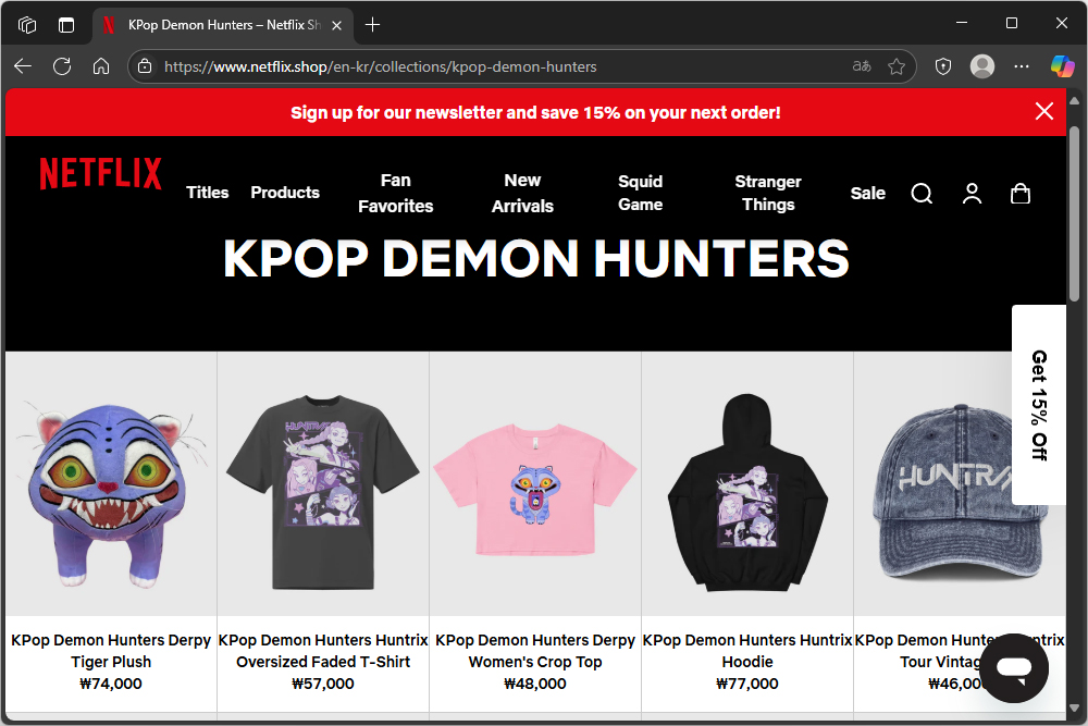 케이팝 데몬 헌터스의 갑작스러운 인기 때문에 넷플릭스 넷플릭스 공식 상품 판매처에서도 정식 제품의 판매를 개시했습니다. 현재는 프리오더 상태이고 핵심 아이템이라고 할 수 있는 KPop Demon Hunters Derpy Tiger Plush의 가격은 74,000원으로 만만치 않은 편입니다. 그리고 티셔츠와 후드, 크롭탑, 모자 등의 제품도 준비되어 있습니다.