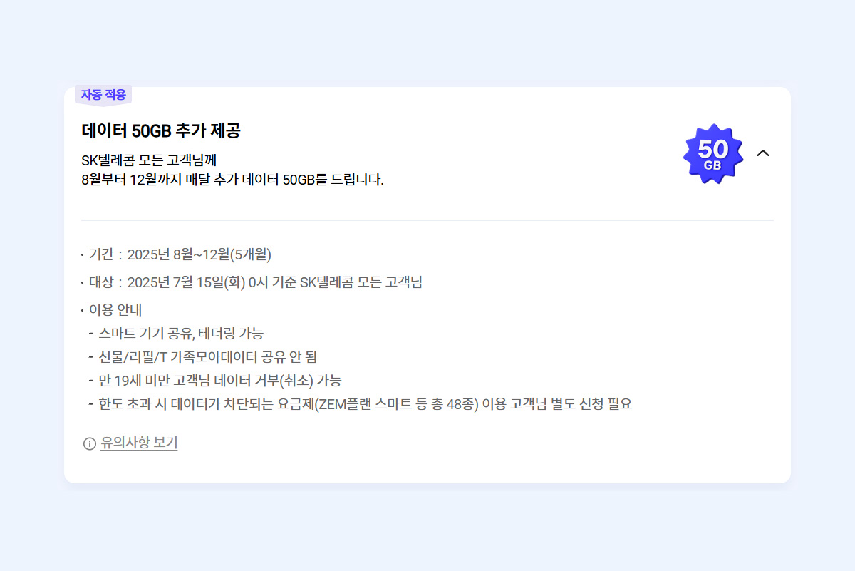 그리고 8월부터 12월까지 추가 데이터를 50GB 더 충전해 준다고 합니다. 스마트 기기 공유와 테더링도 가능해서 태블릿을 같이 사용하는 분들에게는 메리트가 있지만 우리는 이미 데이터 사용량이 일정하게 유지되기 때문에 크게 효용은 없을 것으로 보입니다.