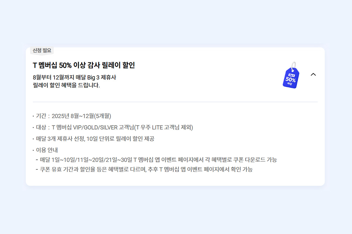 “T 멤버십 50% 이상 감사 릴레이 할인”
