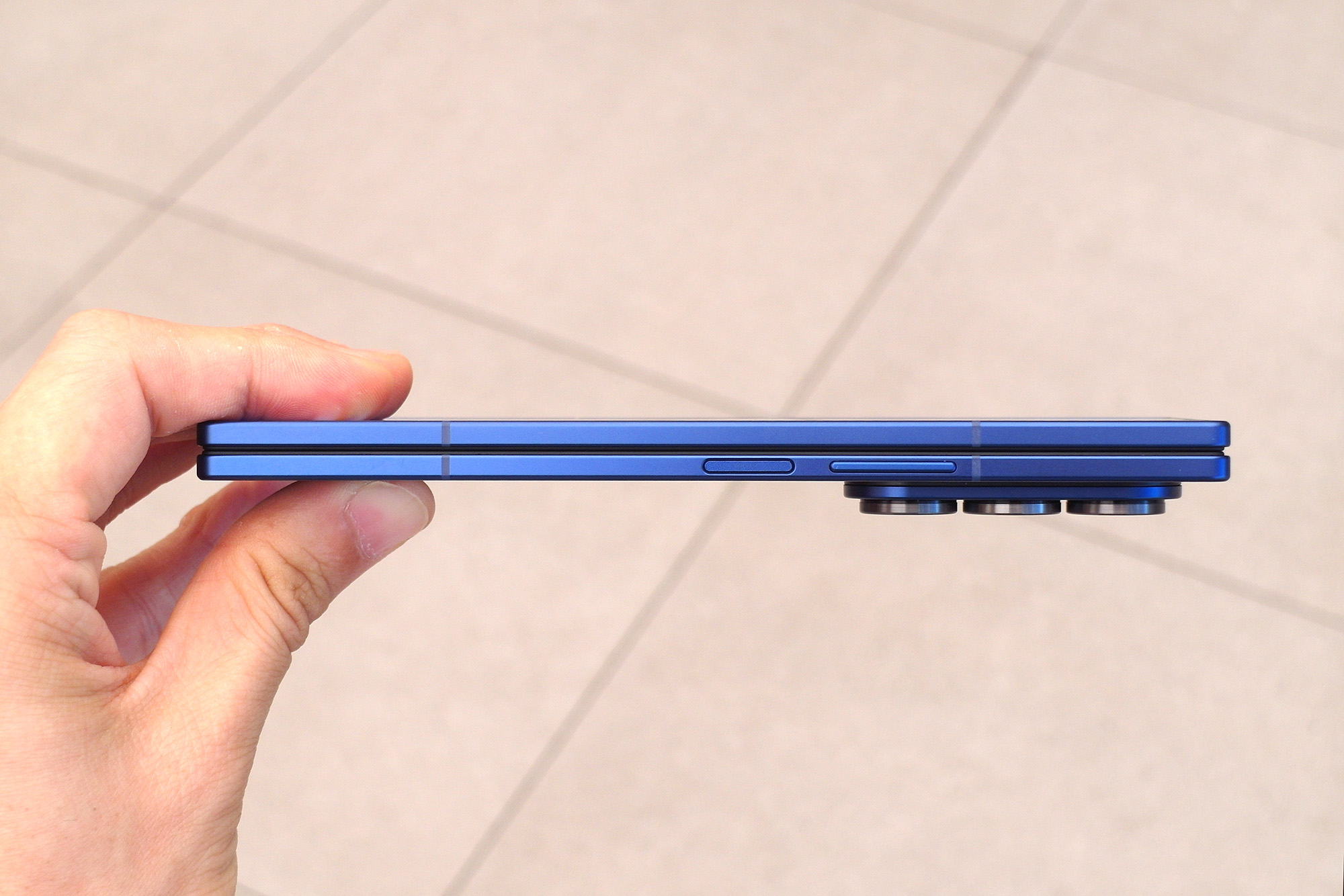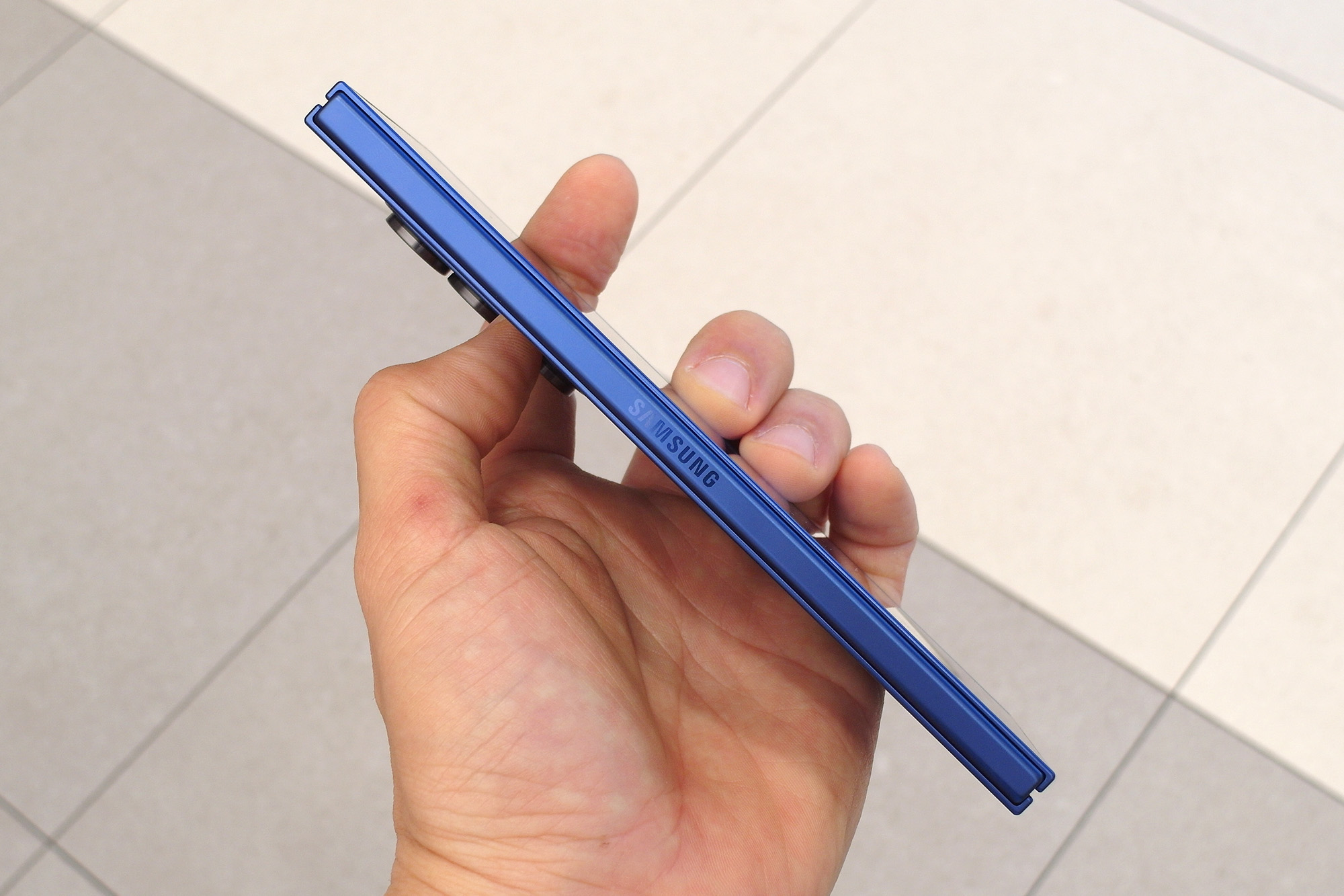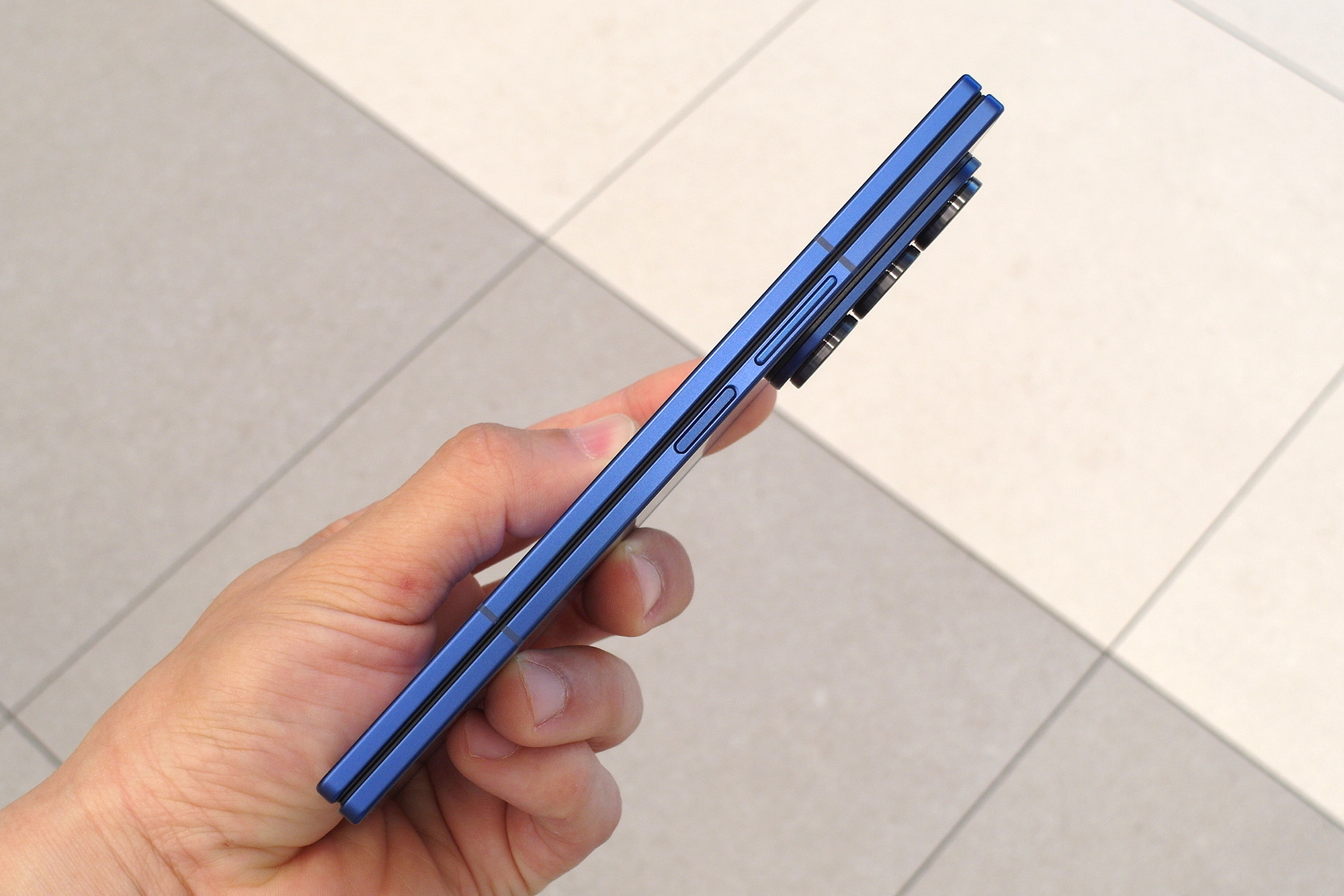갤럭시Z 폴드7의 핵심 가치는 접었을 때 8.9mm, 펼쳤을 때 4.2mm의 슬림한 두께와 215g의 가벼운 무게라고 할 수 있습니다. 실제로 폴드7을 만져보았을 때 가장 체감이 되는 부분이라고 할 수 있는데요. 상당히 스타일리시하다는 인상을 받았습니다. 그리고 옆쪽에 지문인식 센서가 내장된 전원 버튼이 배치되어 있습니다.