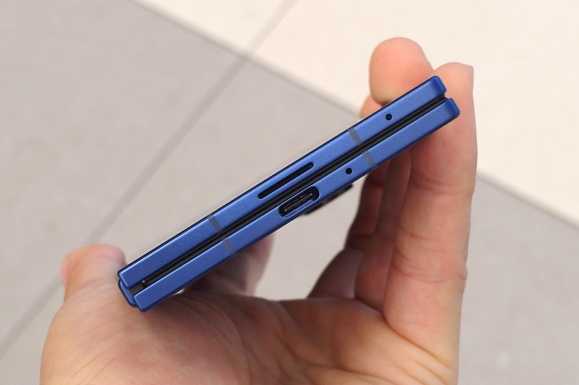 갤럭시Z 폴드7의 슬림한 두께를 가장 크게 체감할 수 있는 부분은 하단에 배치된 USB-C포트의 양쪽 마진을 통해서 확인할 수 있습니다. 참고로 프레임 자체는 내구성이 우수한 티타늄으로 제작되었다고 합니다.