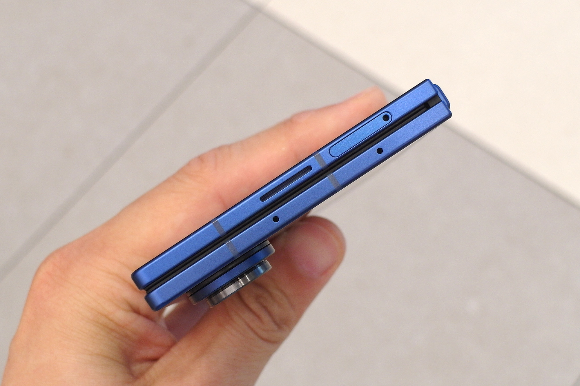 갤럭시Z 폴드7의 핵심 가치는 접었을 때 8.9mm, 펼쳤을 때 4.2mm의 슬림한 두께와 215g의 가벼운 무게라고 할 수 있습니다. 실제로 폴드7을 만져보았을 때 가장 체감이 되는 부분이라고 할 수 있는데요. 상당히 스타일리시하다는 인상을 받았습니다. 그리고 옆쪽에 지문인식 센서가 내장된 전원 버튼이 배치되어 있습니다.