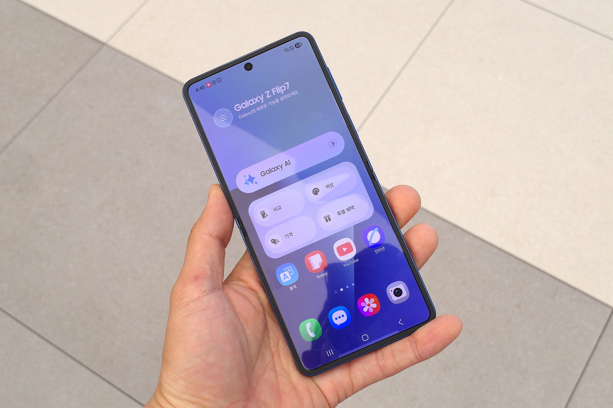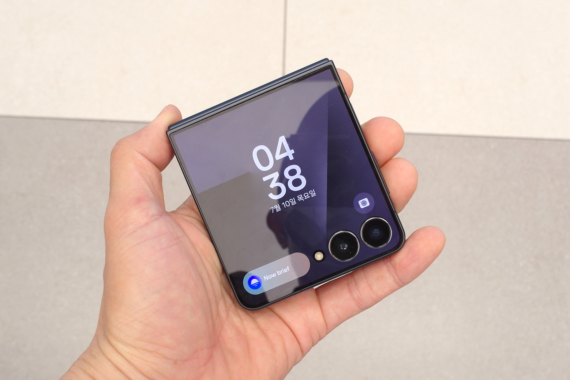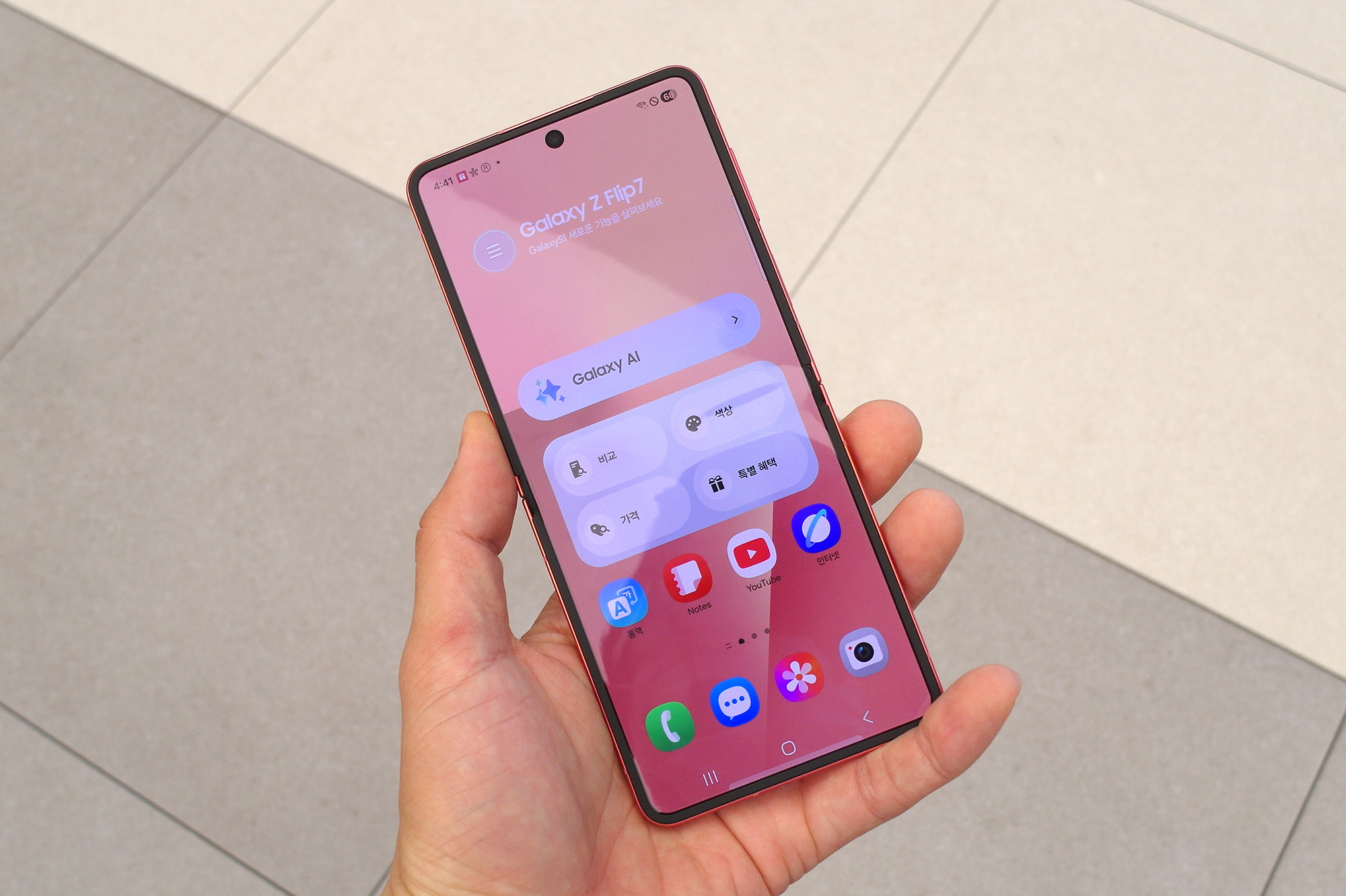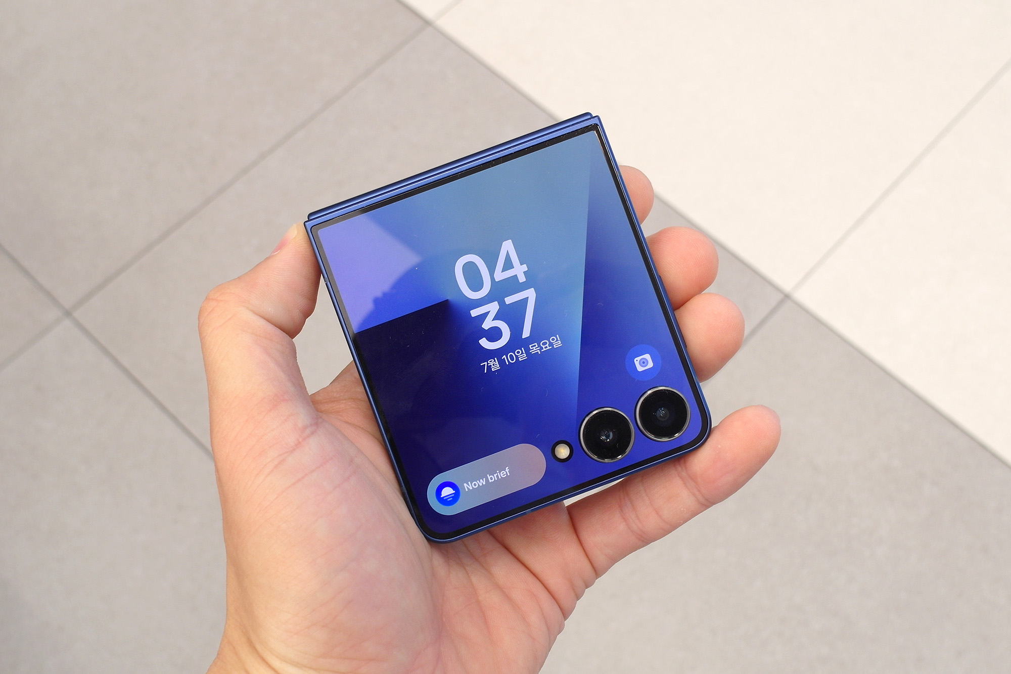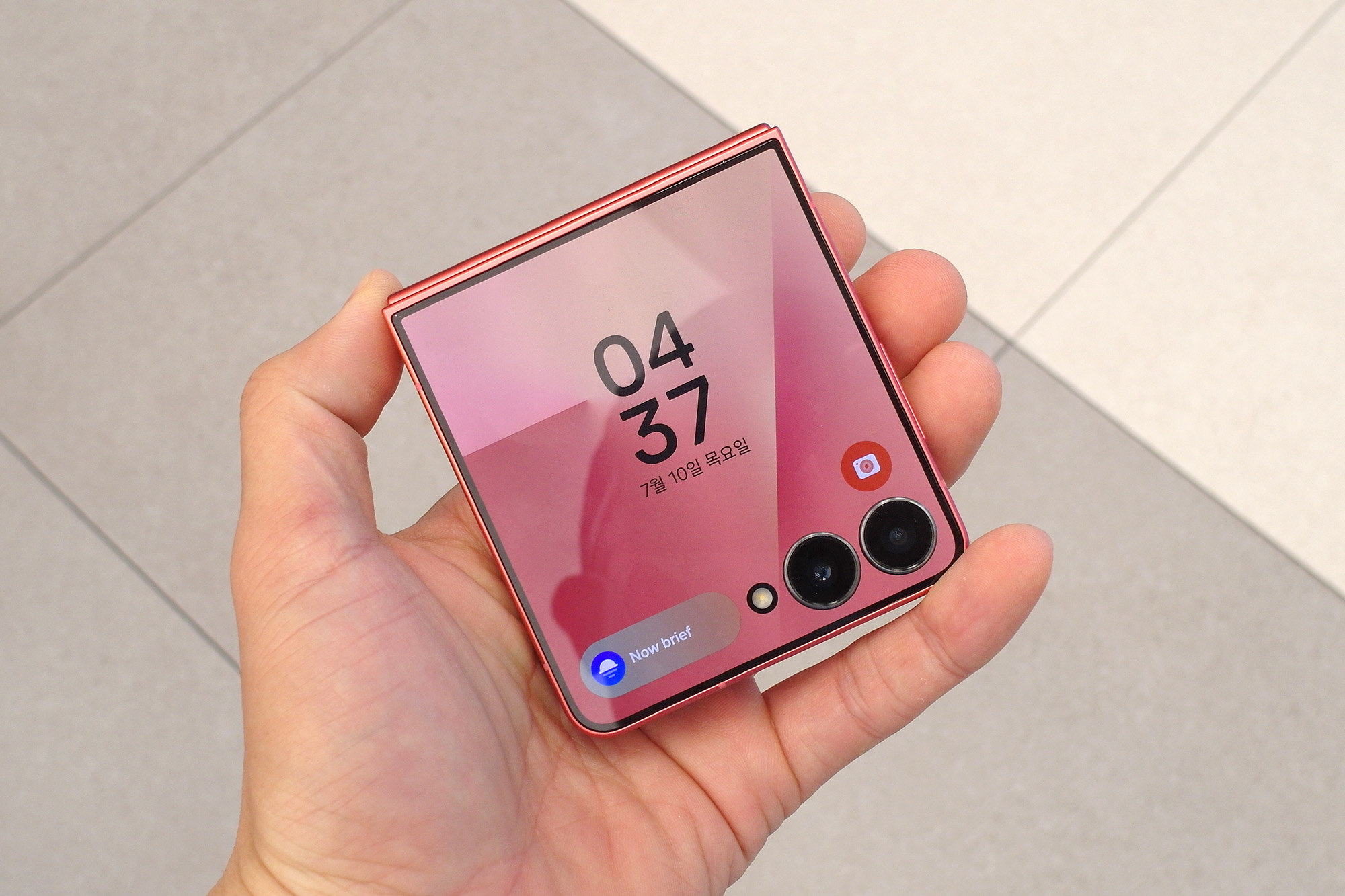 삼성 갤럭시Z 플립7의 전면에는 한층 넓어진 플렉스 윈도우가 탑재되었는데요. 베젤이 1.25mm로 슬림한 편이어서 시원하다는 느낌을 주는 편입니다. 그리고 전면의 테두리 부분에서 색상을 체험할 수 있는데요. 배경화면을 비슷한 색상을 매칭해서 사용해도 좋을 것 같습니다.