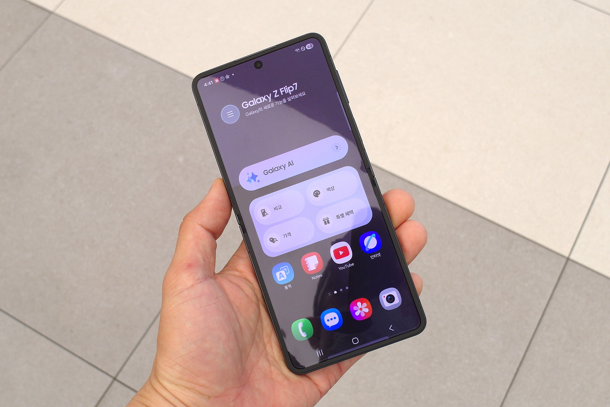 삼성 갤럭시Z 플립7의 전면에는 한층 넓어진 플렉스 윈도우가 탑재되었는데요. 베젤이 1.25mm로 슬림한 편이어서 시원하다는 느낌을 주는 편입니다. 그리고 전면의 테두리 부분에서 색상을 체험할 수 있는데요. 배경화면을 비슷한 색상을 매칭해서 사용해도 좋을 것 같습니다.